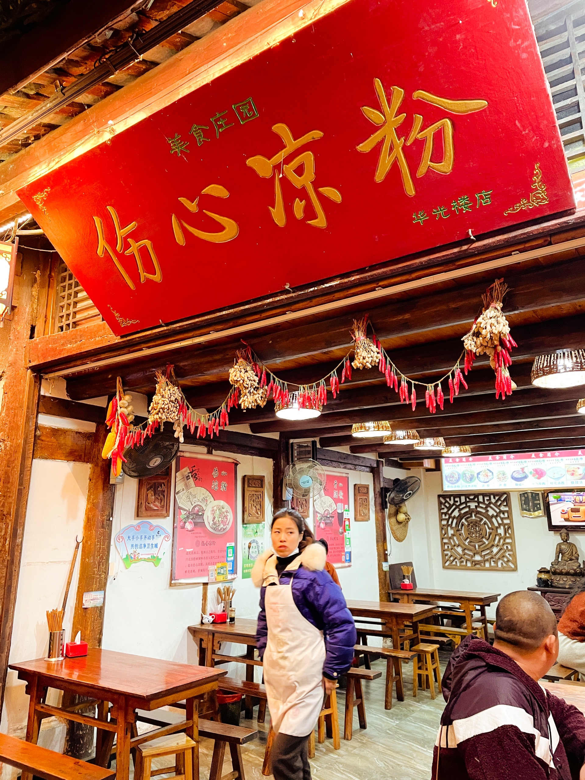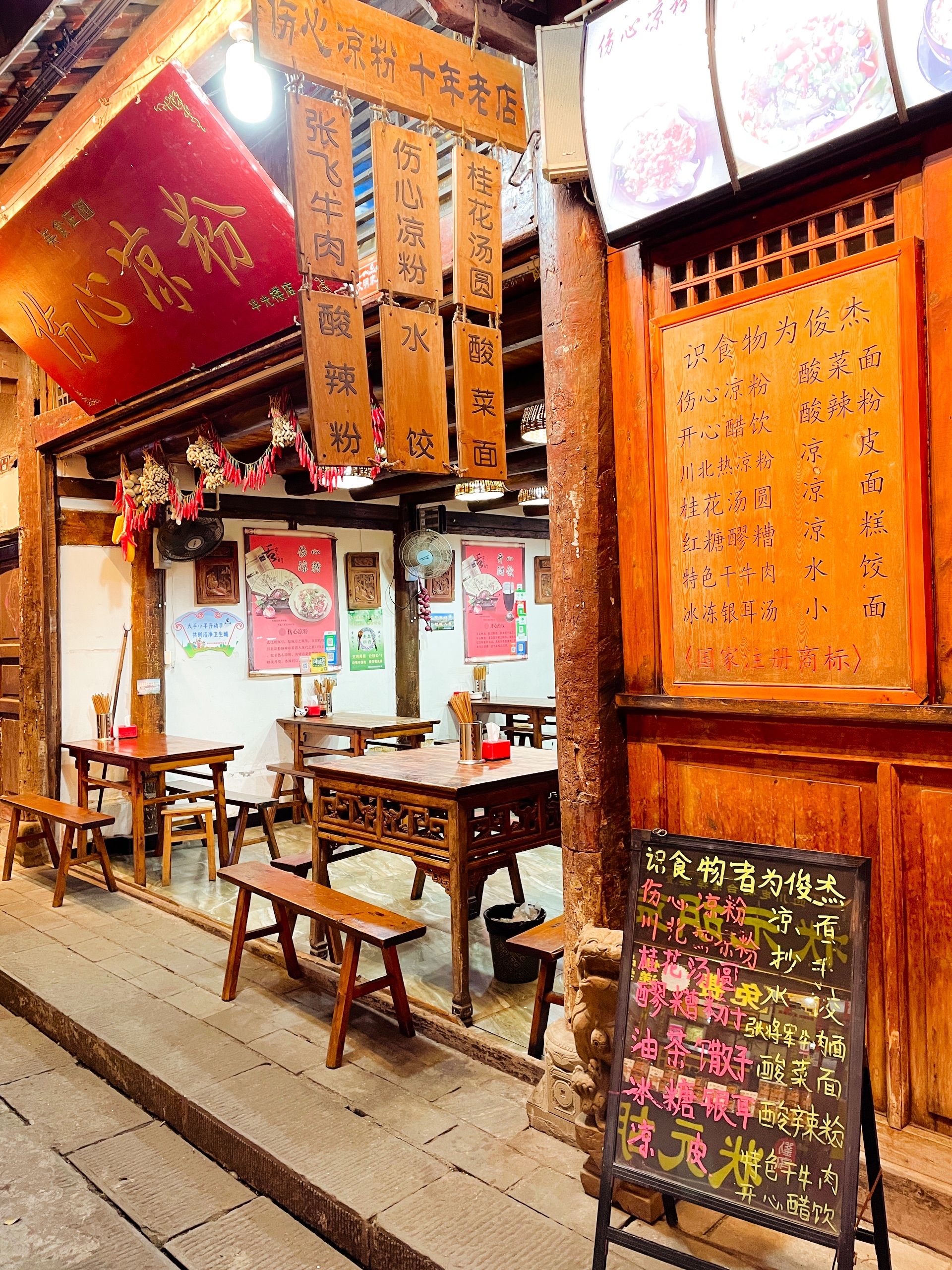 这家店位于阆中古城西街66号,以中天楼为中轴四面散开的十字街上各种美食餐厅,几乎等于特色小吃街。它家开店历史超过十年,挂着伤心凉粉的旗帜招牌十分醒目,虽是小店,但装修得跟古代的客店没有什么区别,和古城一样应景。门口和店里墙上的牌匾把小店招牌小吃都列出来了,如伤心凉粉,川北热凉粉,开心醋饮,桂花汤圆,特色干牛肉,凉皮,凉面,凉糕等。