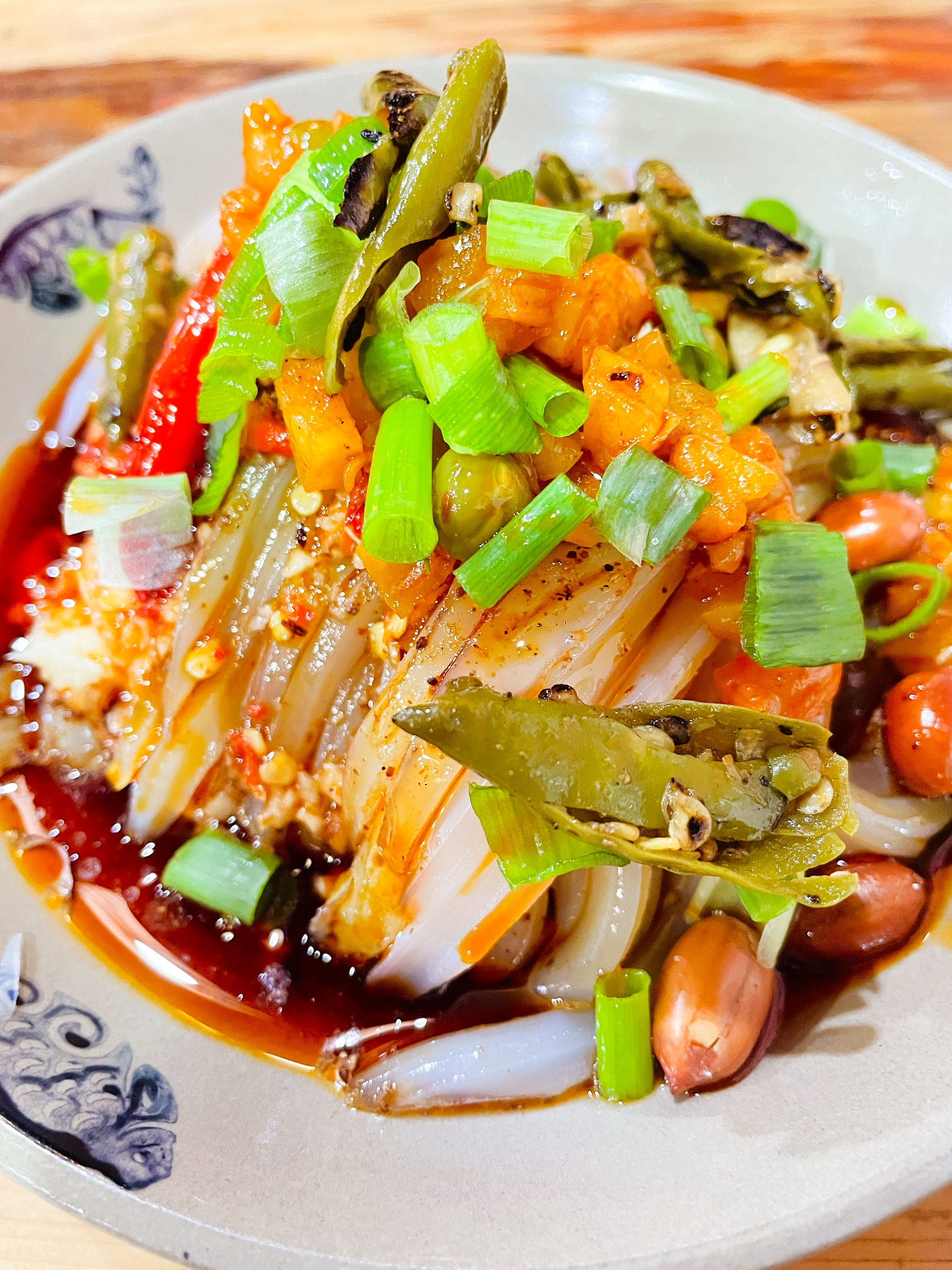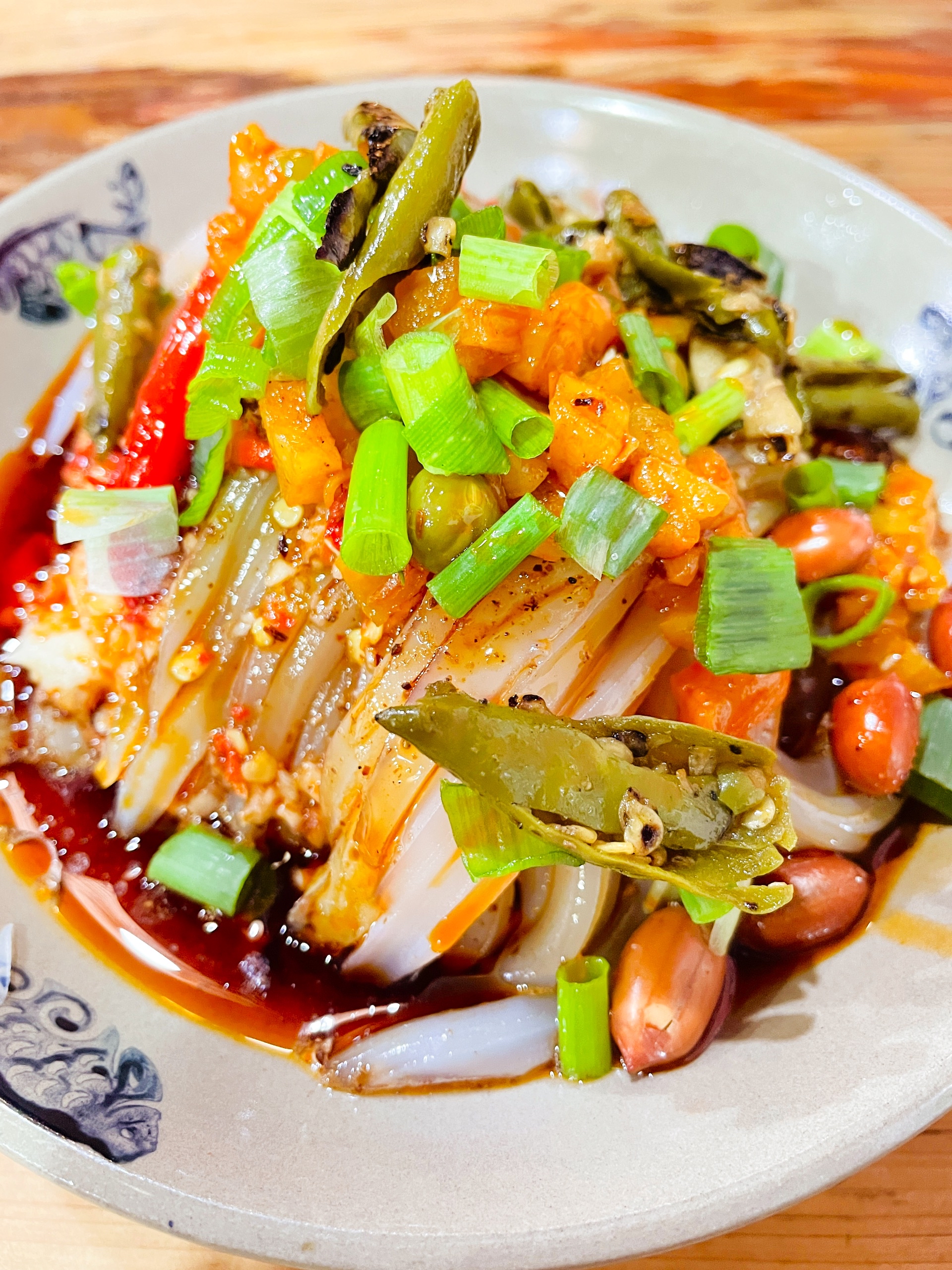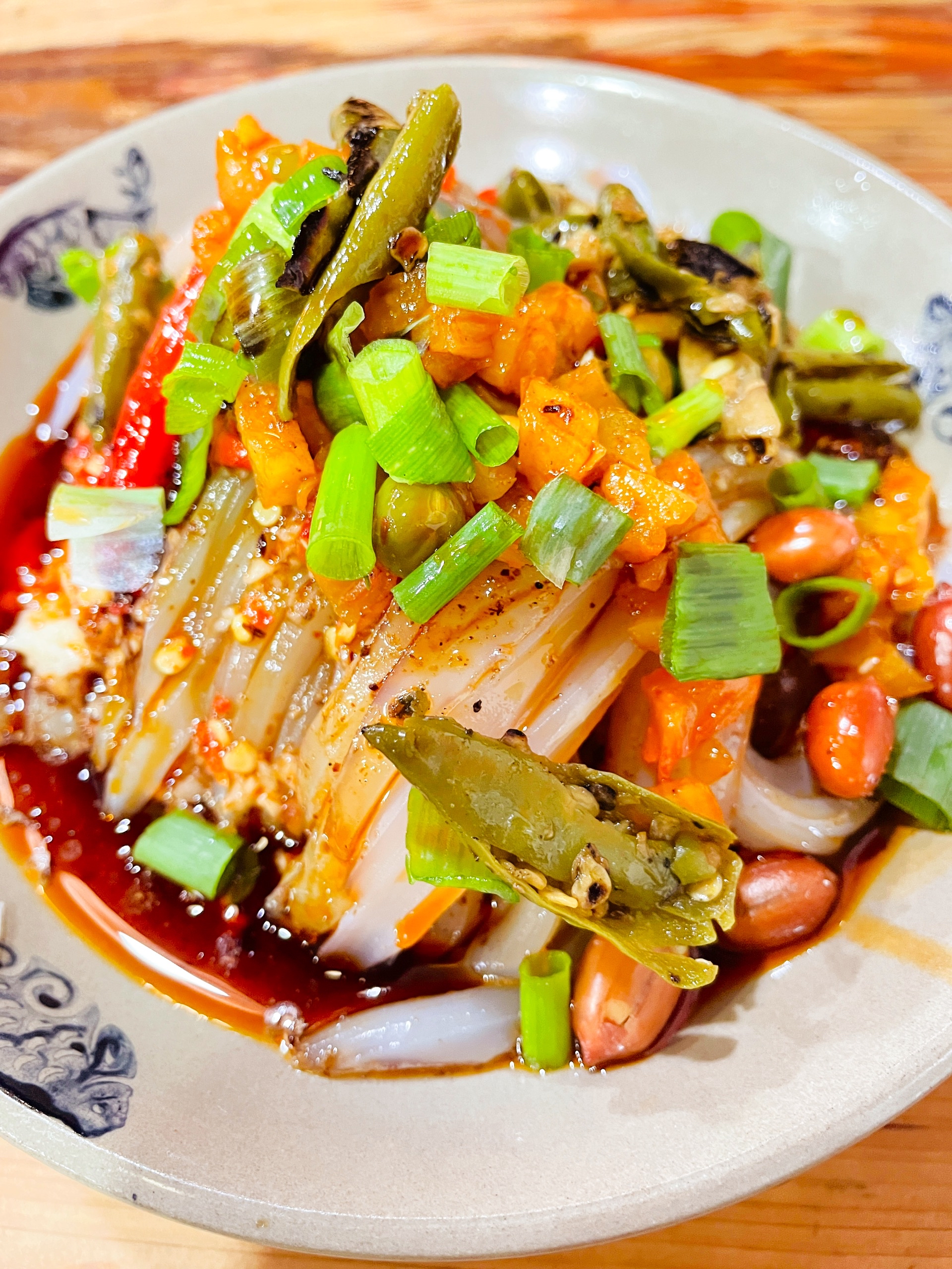 伤心凉粉上来了,品相很诱人。一碗凉粉,还是现在已经很少吃到手工刮刮凉粉。凉粉是条状的,晶莹剔透却吃起来爽口无比,配料用了很多种辣椒调配而成,有海椒,小米椒,花椒等说不上名字的各种辣椒,目的就是辣,辣就完事儿了,再加上香菜葱花,秘制酱料。辣得舌尖炙热,额头冒汗,就成了一份越吃越伤心,越伤心越吃的,伤心凉粉了。就连平常不爱吃辣的我都觉得非常好吃,吃伤心凉粉,吃的就是这个纠结,吃的就是这个辣。一碗伤心凉粉,体验到了人间的美食和百态。