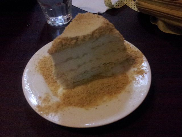 我是路过看见想起来才进去吃的……五十葡币一小块的木糠蛋糕。肉都疼了。不过好好吃……嘤嘤。刚拿出来是沙沙的雪糕一样冷的质感。放久了可能奶油融化了是软滑的质感。,无论哪个都好喜欢!!嘛,其实攻略推荐的是木糠布丁……那个价格比较大众,我是看菜单写着木糠蛋糕好像很牛逼的样子才想吃的。数了一下明明就没有8层??堂食要加收10%(大约是这个数字吧)的服务费。