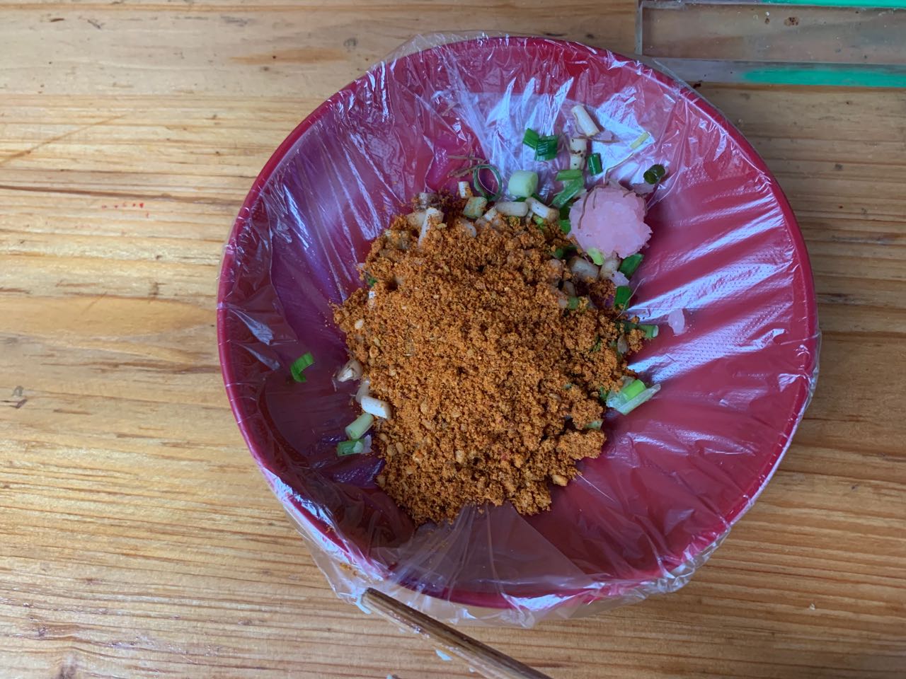 老板娴熟地将刚炒好的洋芋粑夹道盘子里,并询问要蘸水辣椒碟还是辣椒面,第一次吃不好区别,索性向老板同时要了以上两个蘸碟。辣椒蘸碟内不仅是五香辣椒面,还有泡萝卜丁和葱花。