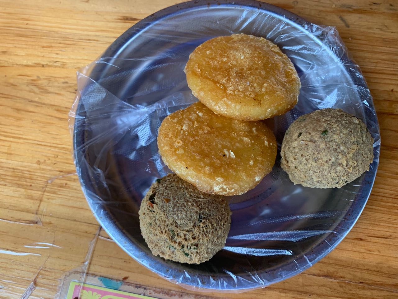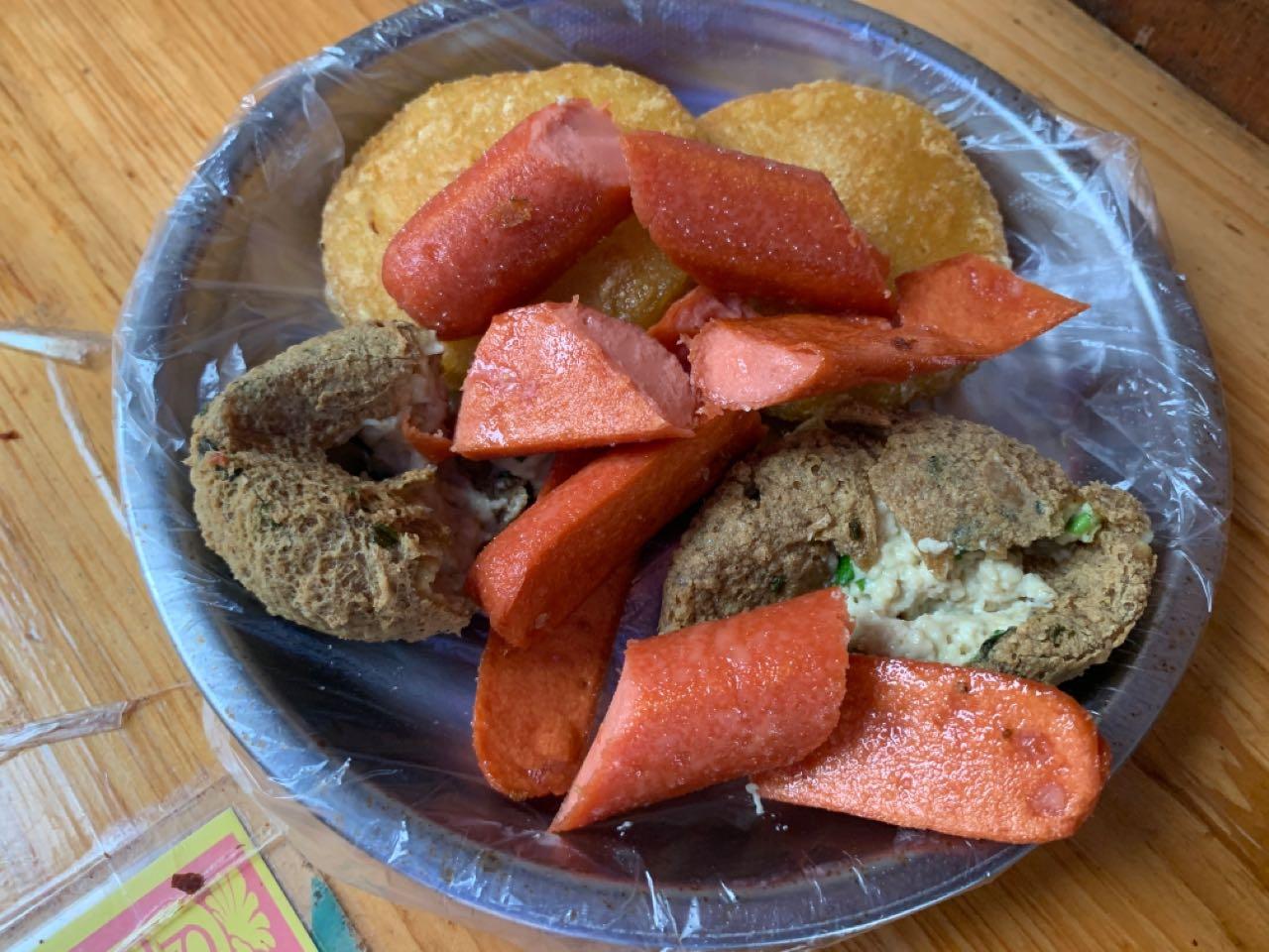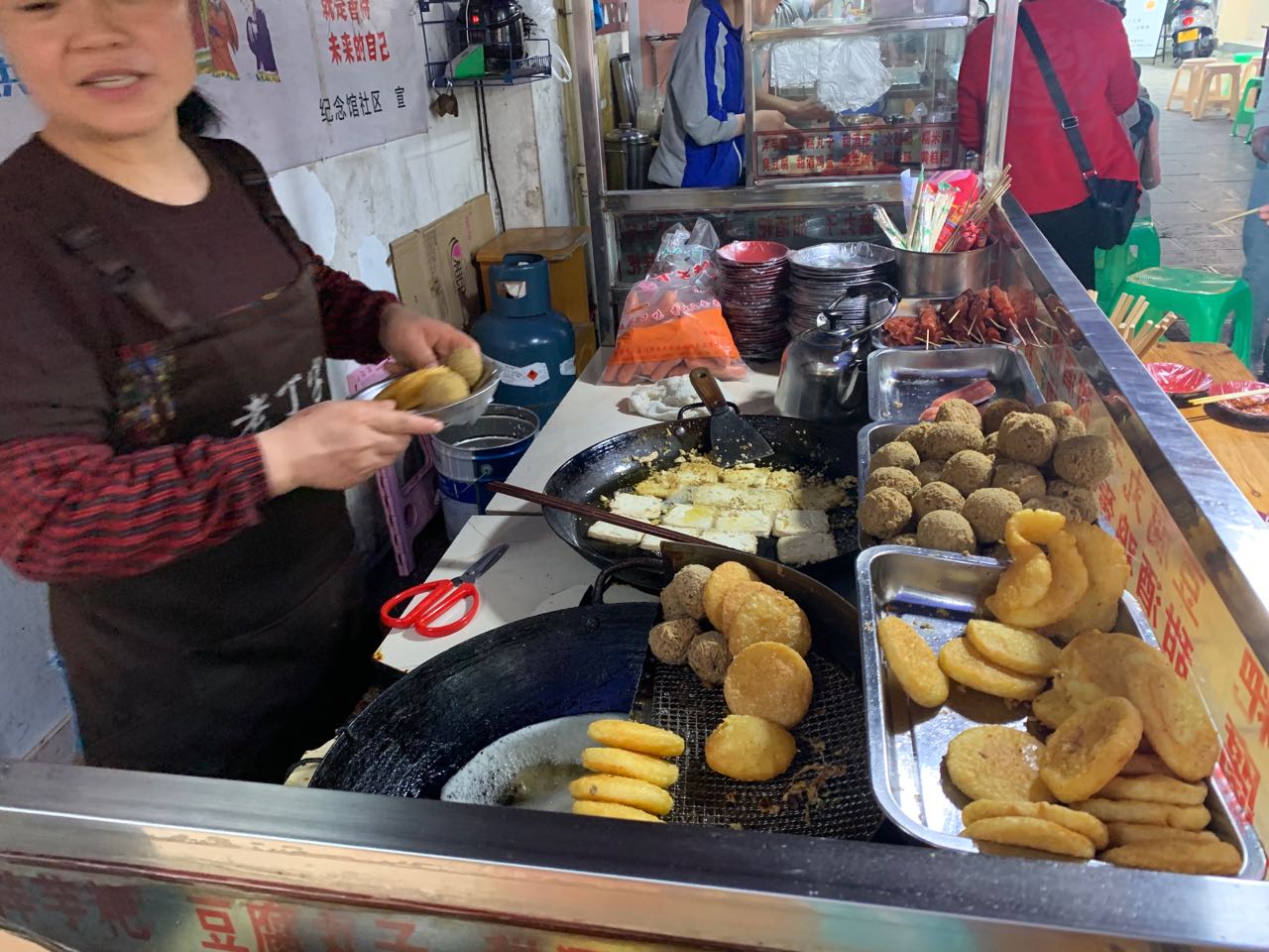 在一处小巷中发现一家油炸洋芋粑的生意特别好,小摊虽然不大,三边以条凳围桌,但是一直没有空位,食客一批接着一批,好不热闹。观察了2分钟后,果断上前点了洋芋粑、豆腐圆子和小朋友最爱的火腿肠等。