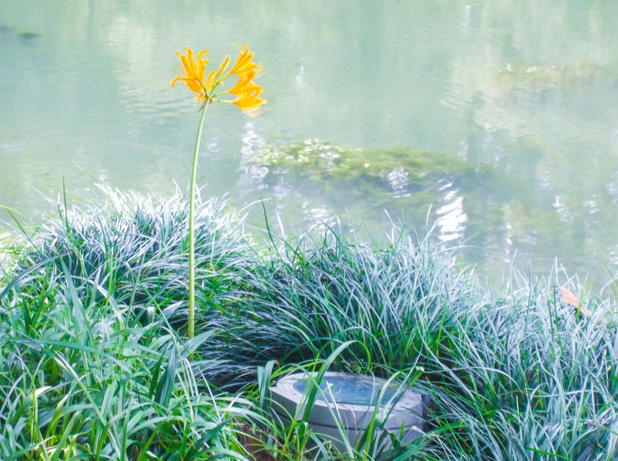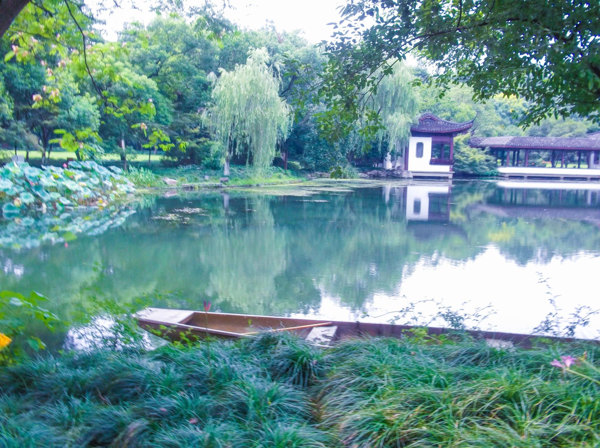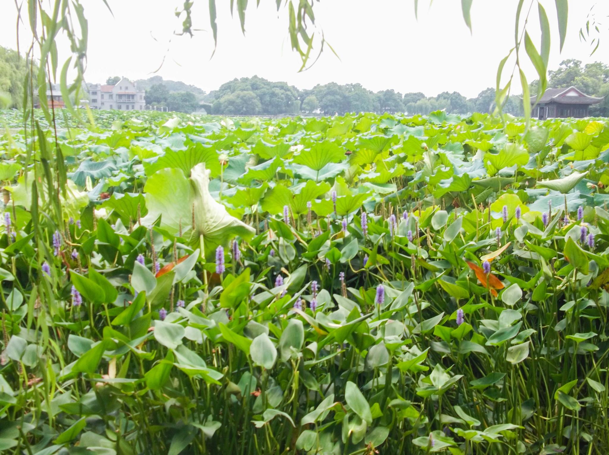 宁静的湖面上,分布着红莲、白莲、重台莲、洒金莲、并蒂莲等等名种荷花。莲叶田田,菡萏妖娆,清波照红湛碧。