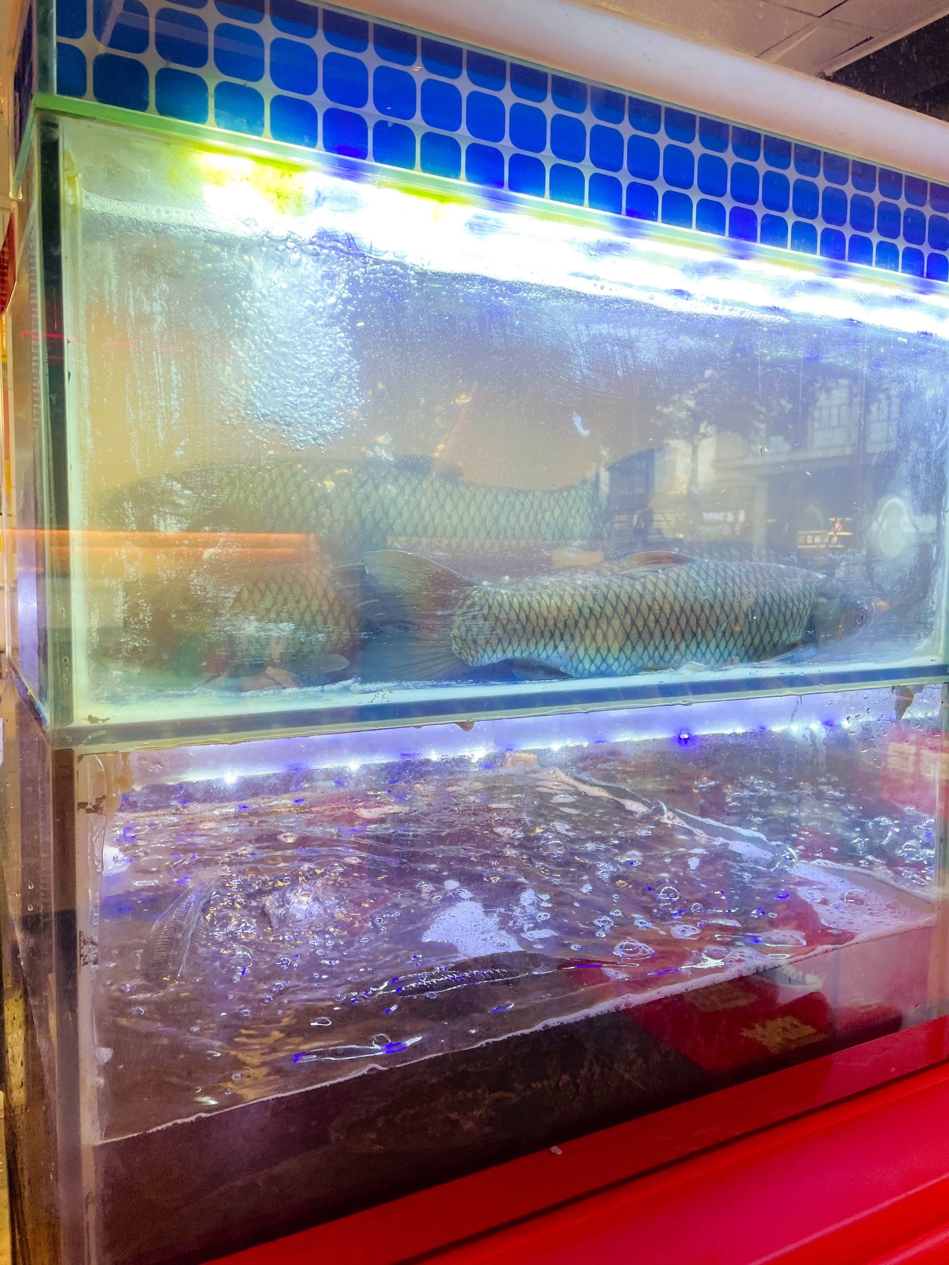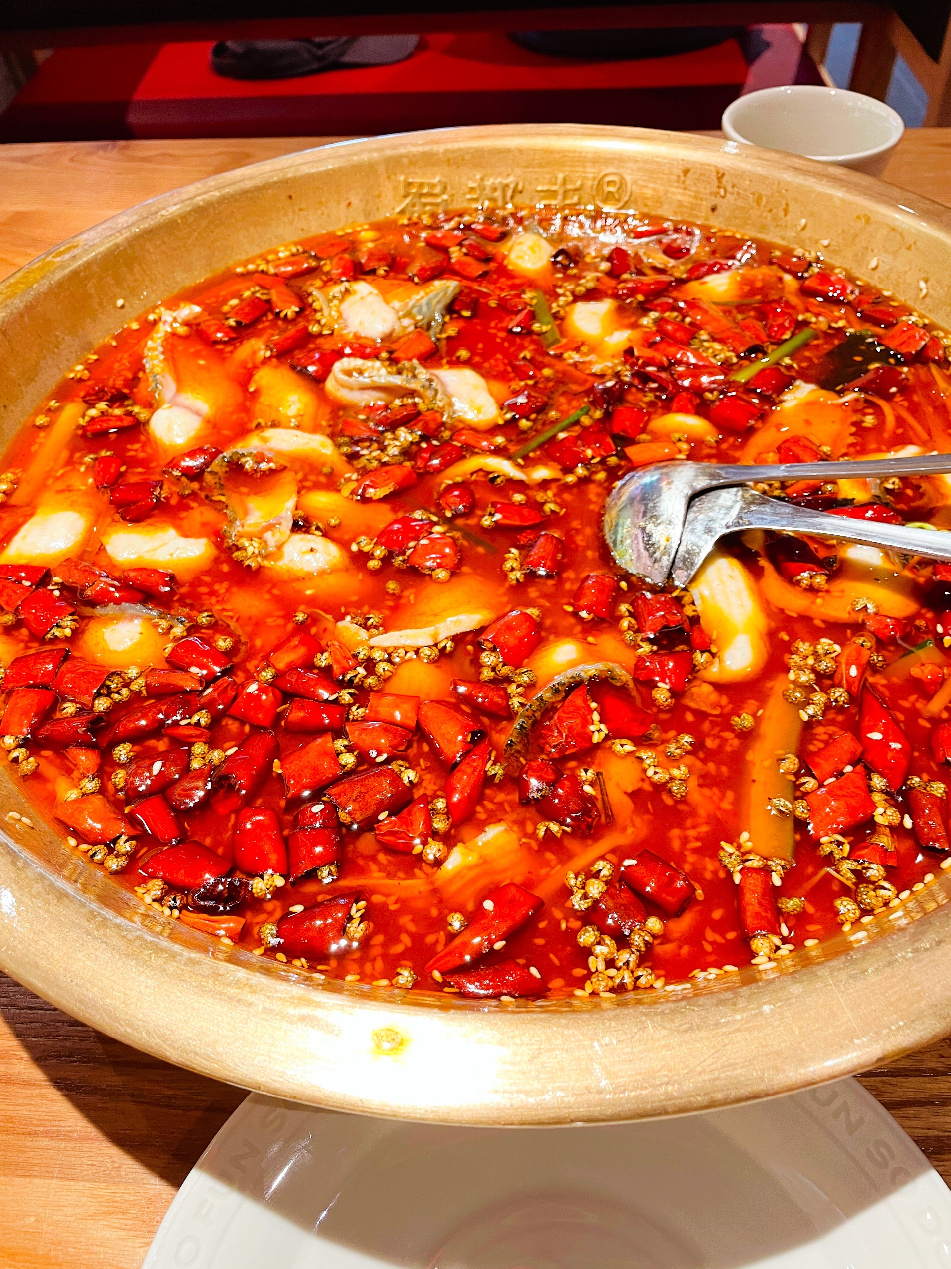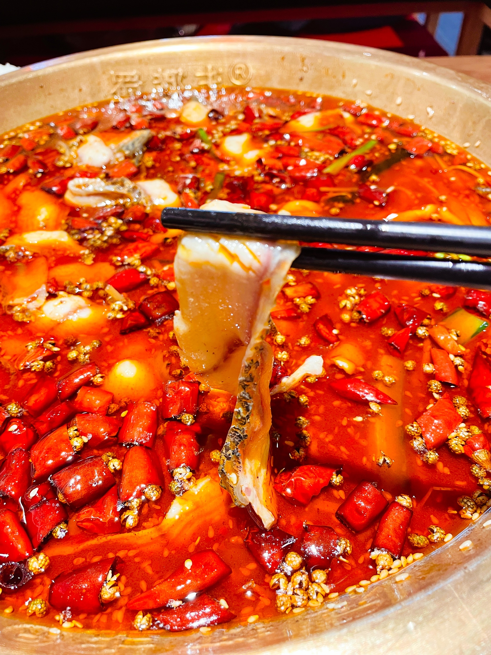 服务员态度不错,就是人太多了,忙不过来的情况下还嘘寒问暖,积极递被子加水。厨师和服务员每次上鱼时都会说到四川话吆喝:“幺妹儿~!上!活!鱼!”。十五分钟后,重头戏水煮鱼终于来啦,金色的大盆端上来,漂浮着满满一层红彤彤红辣椒和芝麻粒,整整一大铜锅的水煮鱼,果然很香看了瞬间食欲大开。服务小哥帮忙捞取浮在表面的辣椒,然后免费制作成辣椒酱送给你。