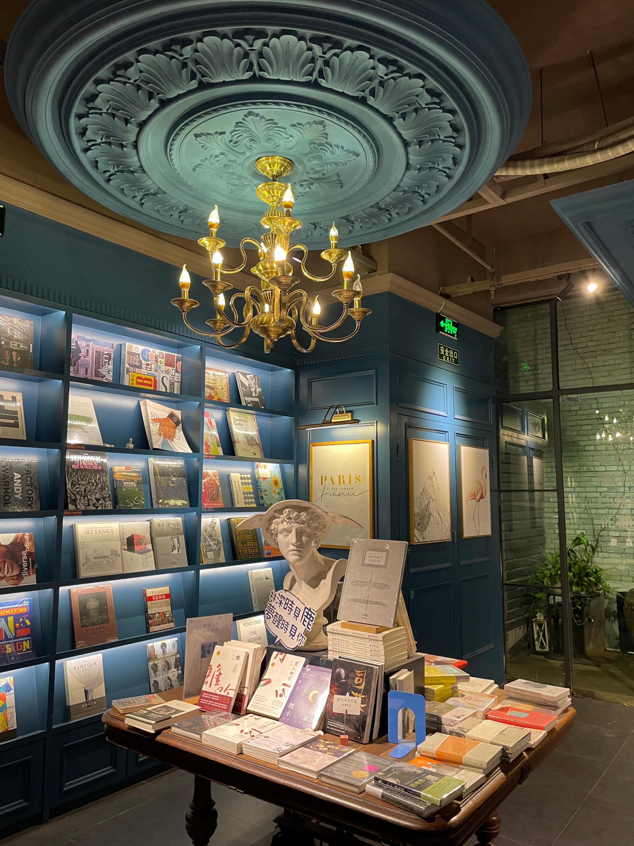 整个书店柔和的赭蓝色营造出静谧的氛围,暖黄色的灯光光晕正好,古雅而浪漫怀旧家具与精致小物被随意地放置在各个角落,每一处转角都有惊喜。