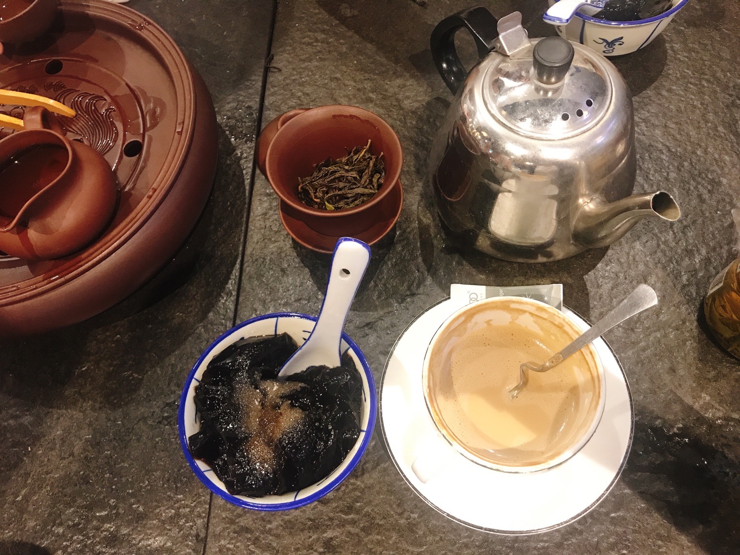 4点的飞机,我们2点就到了机场,机场很小,也没什么正经候机厅,干脆去一家茶室里喝茶玩游戏,小姐姐点了潮汕工夫茶泡白茶,80一壶配2个杯子好贵好贵,大众点评给好评可以送酸梅汤或者草粿,我选了草粿。