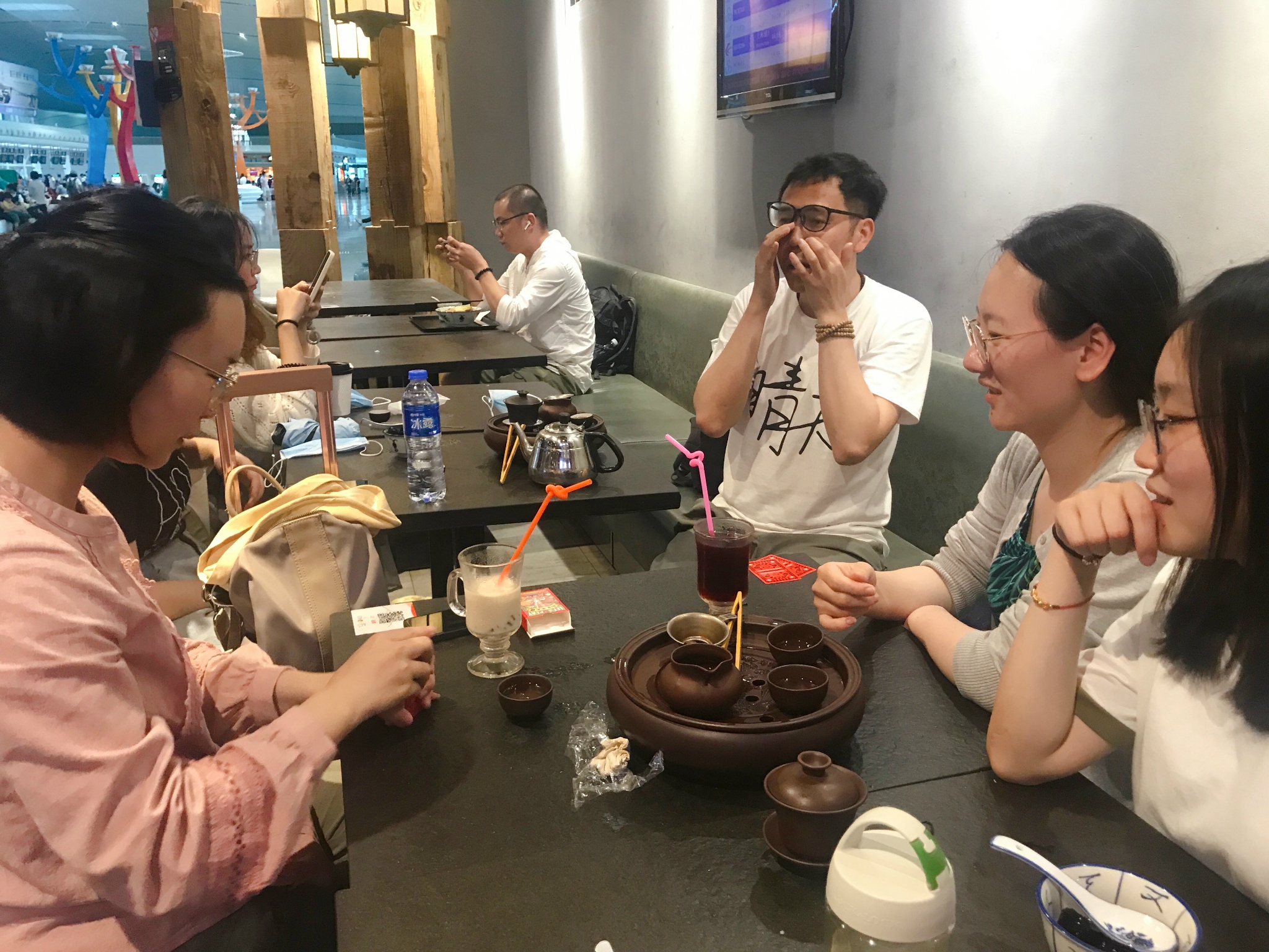 机场很小,也没什么正经候机厅,干脆去一家茶室里喝茶玩游戏,小姐姐点了潮汕工夫茶泡白茶,80一壶...