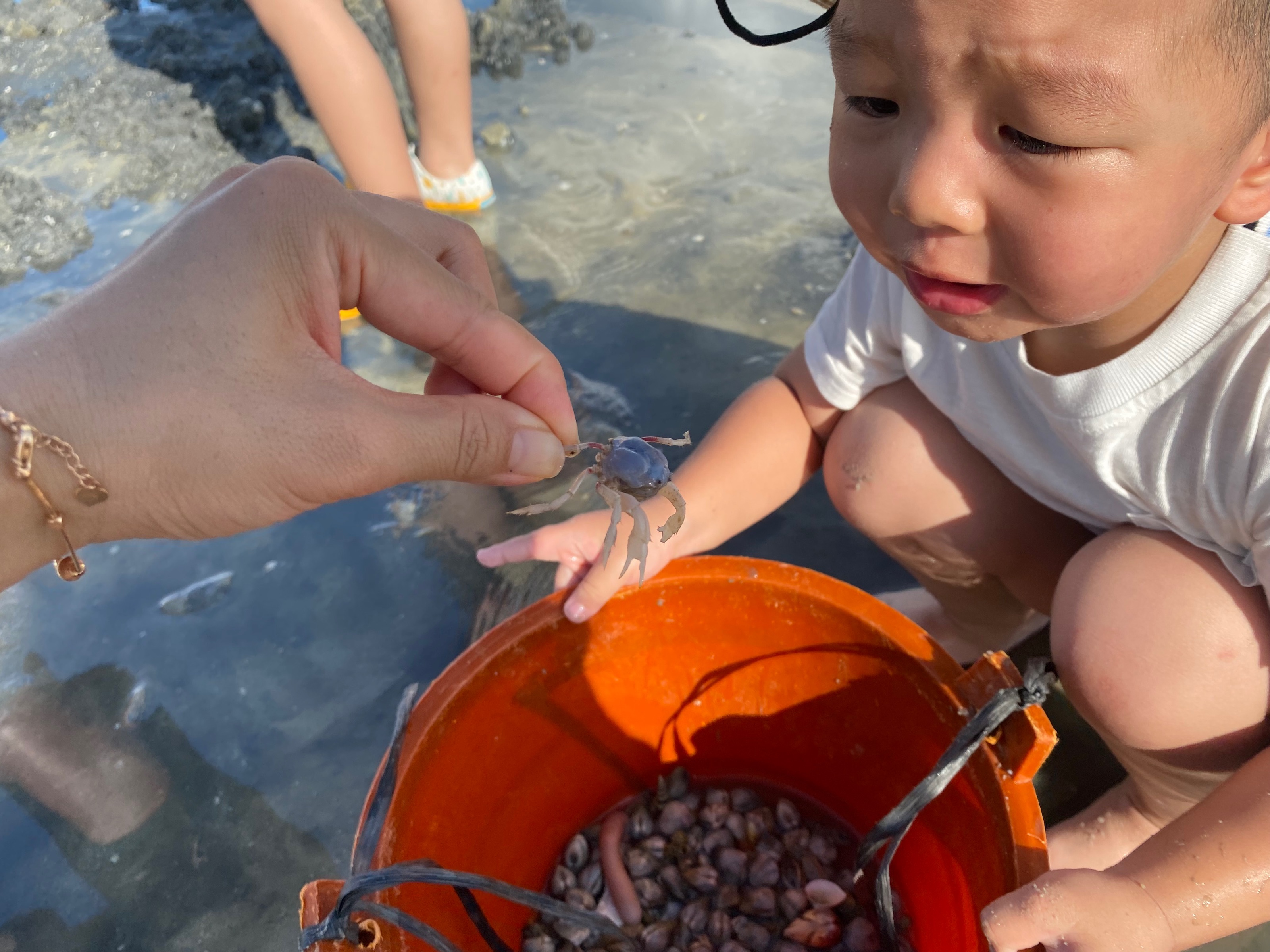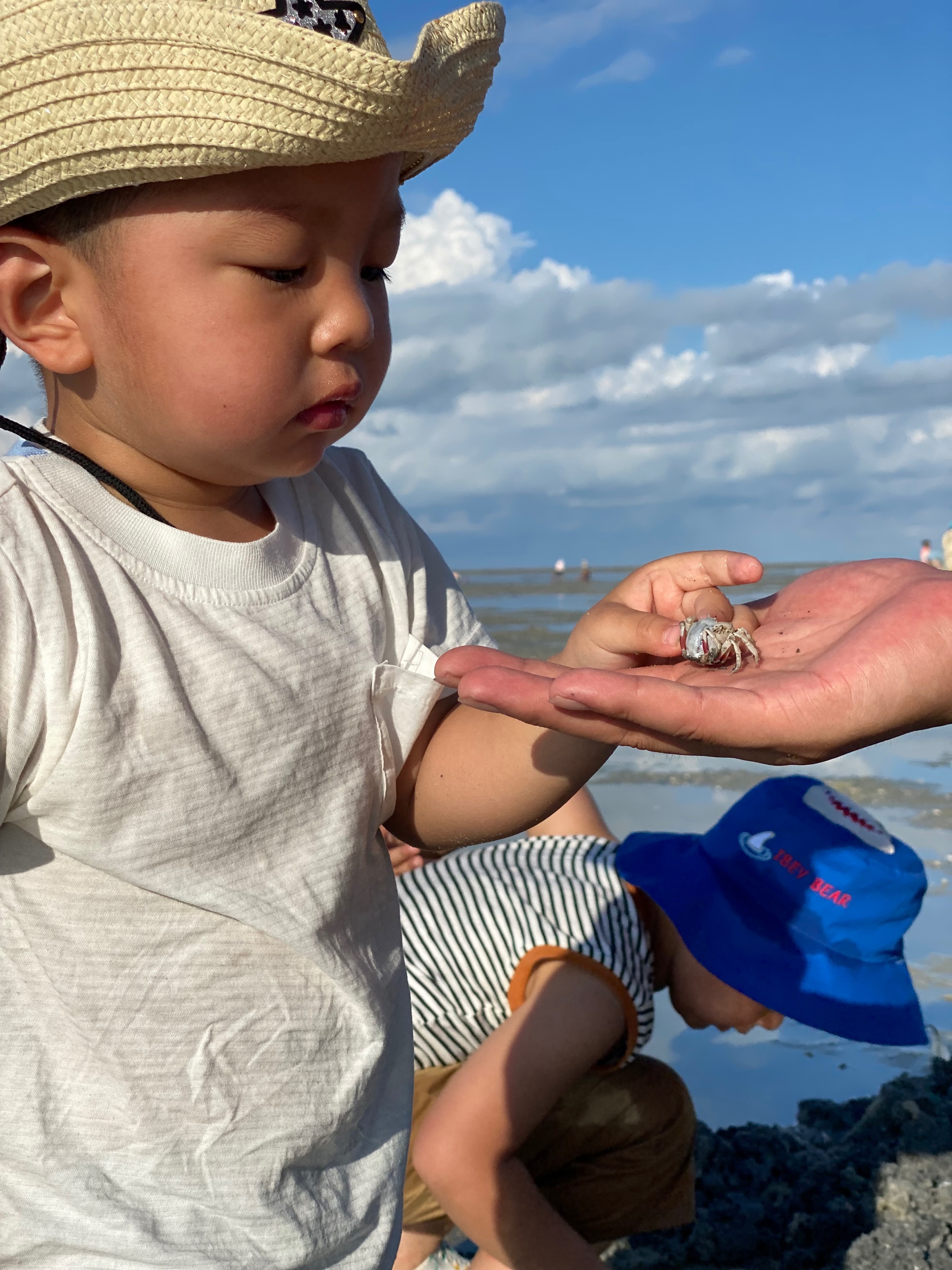 乐乐看到跷跷板非要爷爷陪着玩。三个小朋友第一次赶海,刚开始的时候特别兴奋。挖到不少小螃蟹