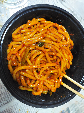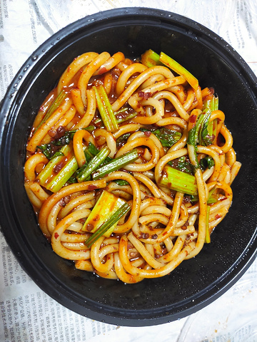 这家店所在地是开发区的一个传奇,五彩城,五彩城里有很多不为人熟知的场所,这家店所在的山顶广场就是其中的一个,如果不是前两年朋友在这开了个店,我这么多年从来就没想过要上来看看。 上次说了,他家的环境非常简陋,想吃环境和情调的人请绕行。 位置就在五彩城转盘东侧路口,继续往东五十米左右,有个北侧的路口上山,山鼎是本色酒吧,酒吧西侧就是一排小饭店,这家店名列其中。 前边说了,他家在山顶广场,所以肯定有停车场,还不小,能停老多车了。 素炒米粉,八块钱一份,简单纯粹,我的最爱。 这回要了两份,一份爆辣,一份免辣,打包带走。 服务很好,打包盒免费。 走的时候,服务员很客气的提醒,辣的盒子上边做了标记,我还说,辣的一眼就能看出来,不用标记。回家一看还真不行,肉眼看起来还真不是很明显,不辣的看起来和辣的差不多,我发到这里大家看一下,拌前根本就不明显,大家吃前一定要闻一下或者拌一下哈,不要大约摸。 口味就是正常而标准的新疆口味,爆辣,齁咸,但是我喜欢,还会再来。