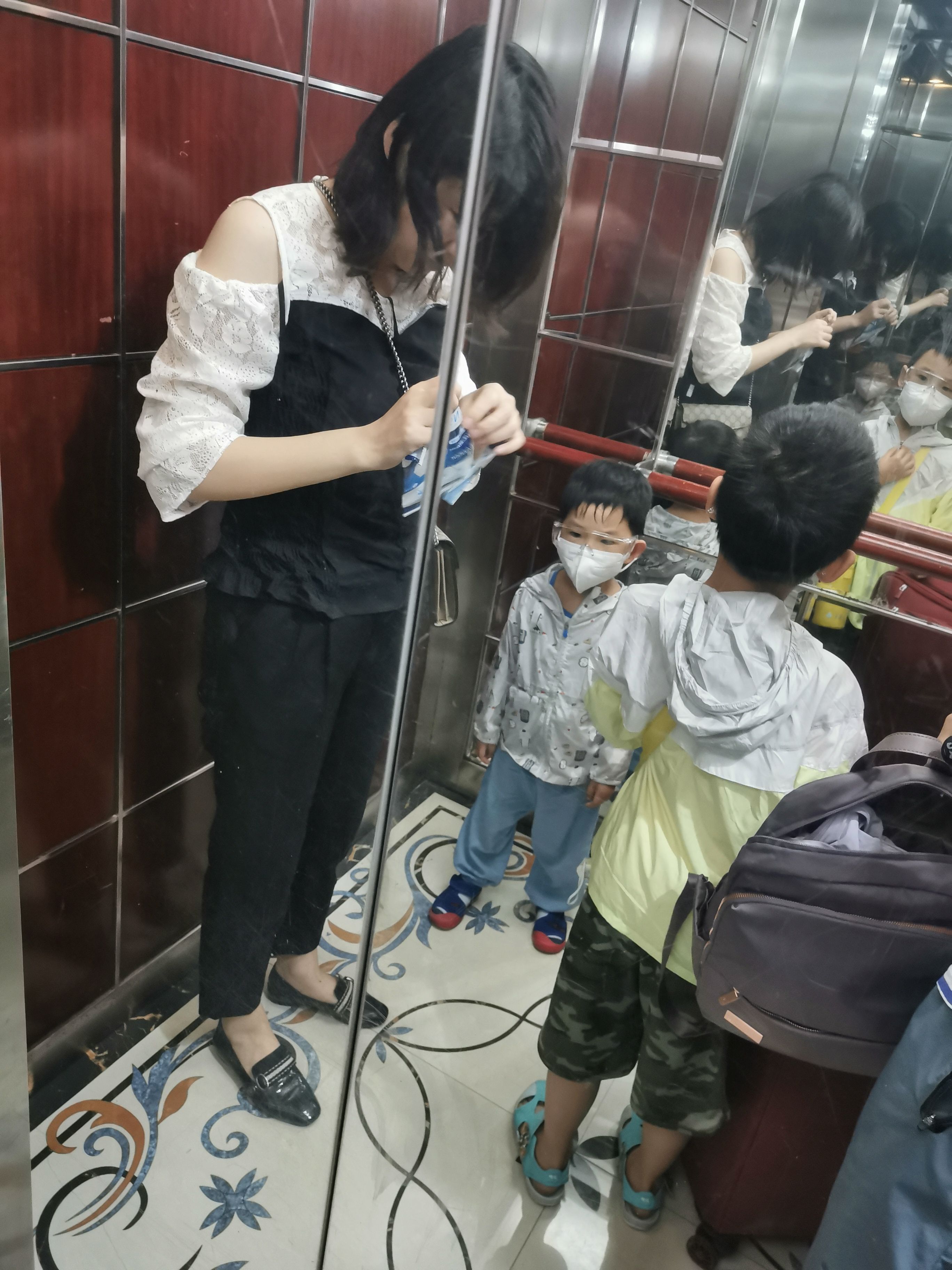 俩娃特别懂事,5点叫他们起床,都很快就爬起来了,没有一点哭闹,看来旅行真的可以治愈一切,哈哈。这是做好防护后,坐电梯下楼,时间是早上5点13分。