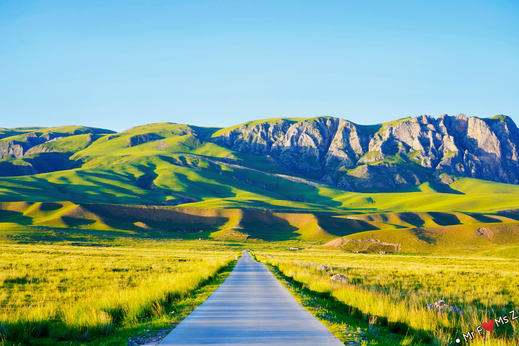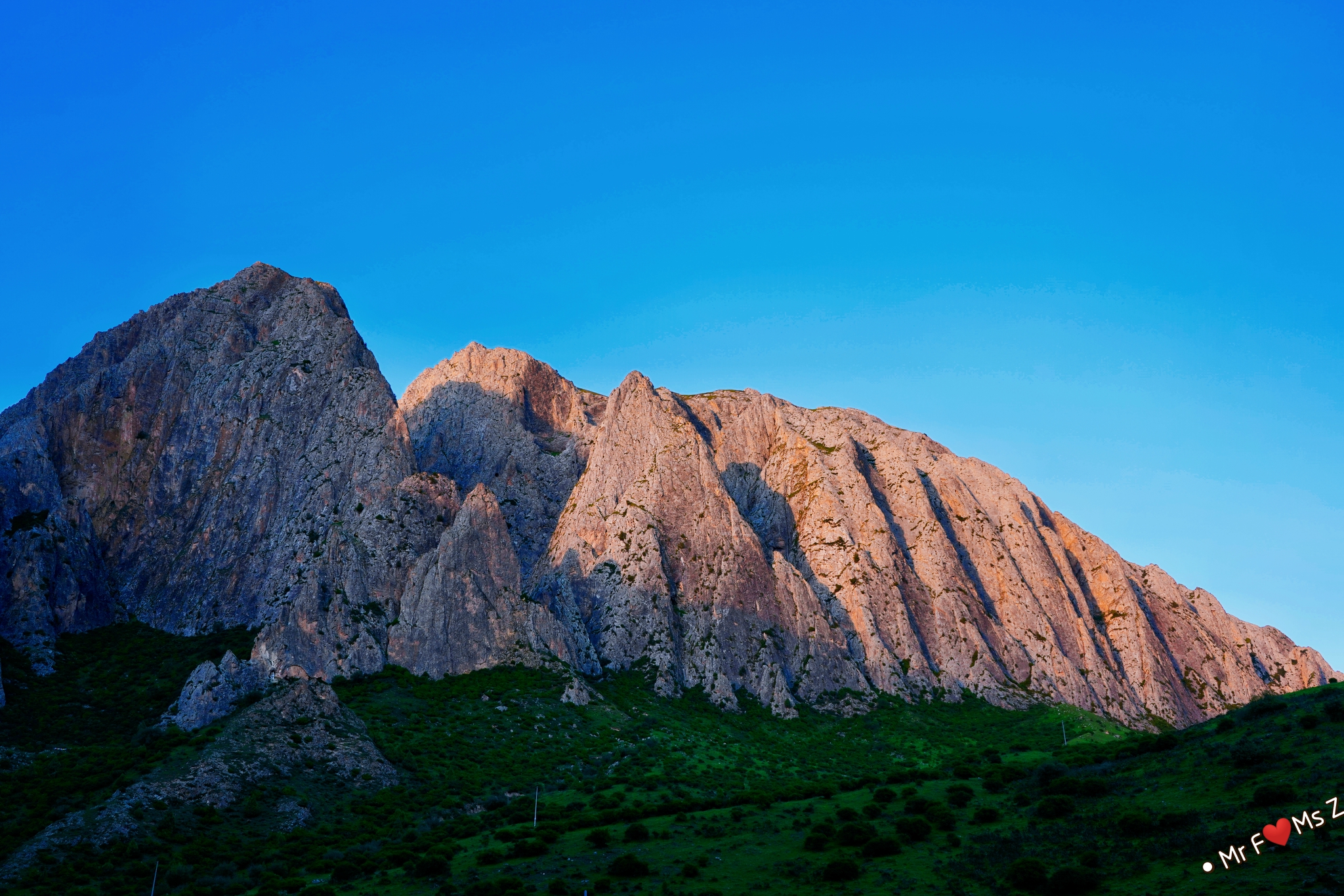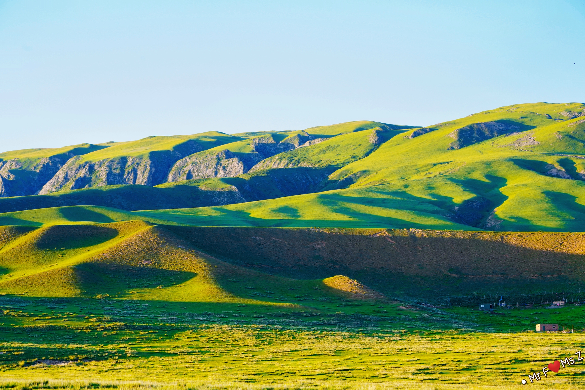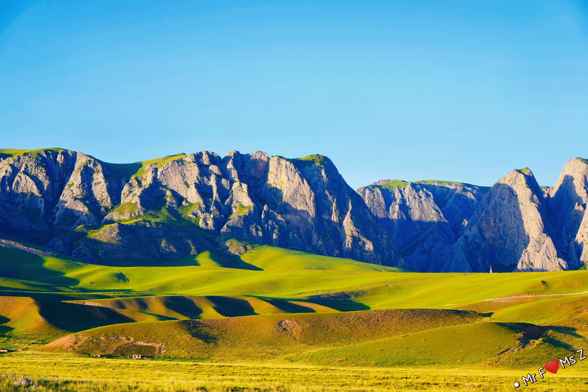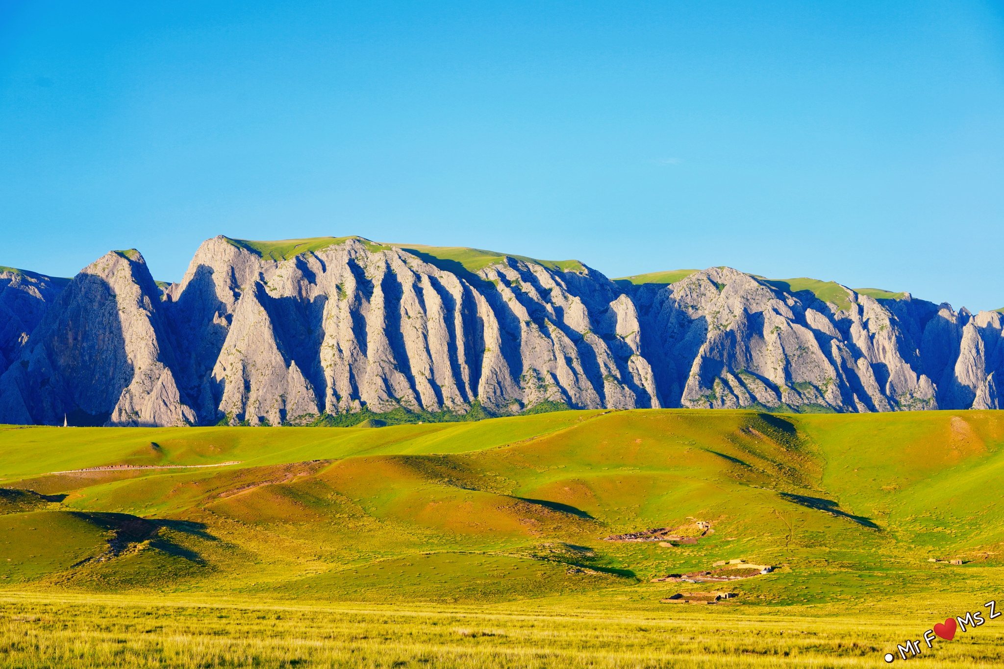 无垠的草原被陡峭的石崖陡然分隔开来,夕阳西下,落日的余晖洒满整个山体和草原,竟平添了几分迷幻的色彩。