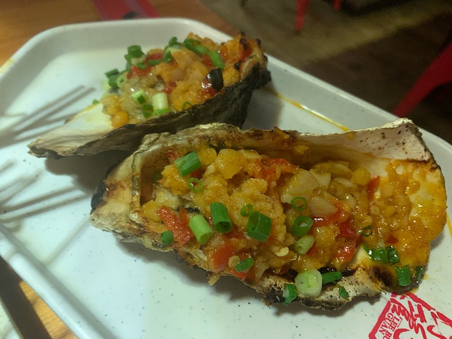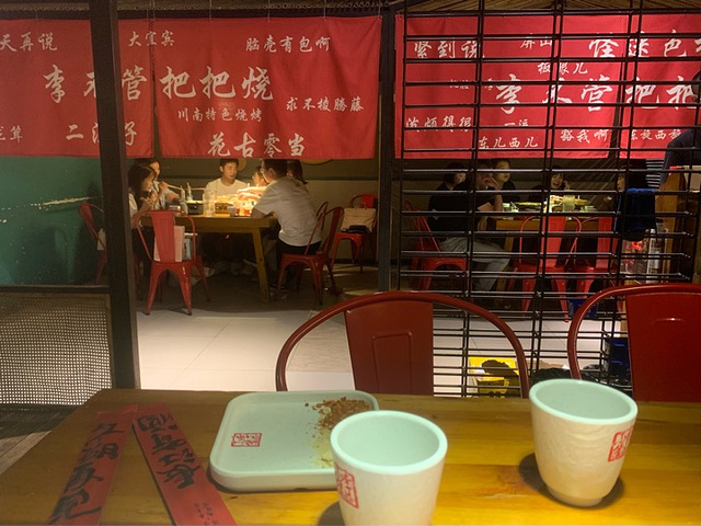有朋友吃过这家连锁,就来试试。 加会员可以免费领一听雪碧或者可乐。 「正宗把把烧」真的不错,几乎没有踩雷的点,比较推荐牛肉、鳝鱼、鸭肠、秋葵和蒜苔。特别是秋葵和蒜苔,真的让味蕾有了新体验。唯一不太好的我感觉是五花肉,有一种奇怪的佐料在里面。 「包浆豆腐」很嫩,现在撒折耳根好像是标配了,总体说来很不错。 「虎皮鸡爪」略咸,但还挺好吃的,鸡爪比较软烂。 「烤生蚝」毛多肉少,不值得。 吃得差不多的时候会有服务员来问菜品如何,能及时收集用户反馈挺好的。 是不是有老奶奶来卖花,看到一个年纪比较大的奶奶,买了黄果兰。