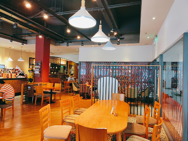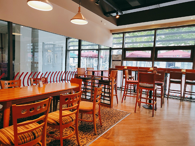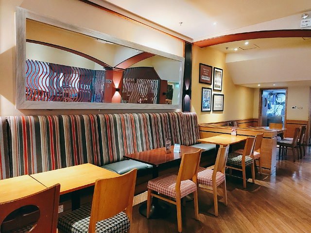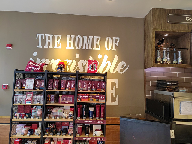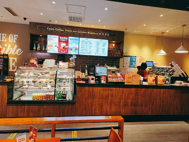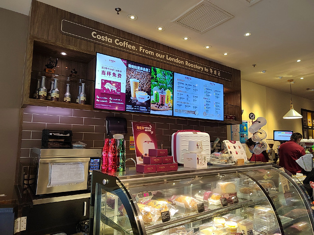这家“COSTA COFFEE(上海外滩)”咖啡馆位于上海市黄浦区中山东一路387号,就在外滩观景平台下面的临街商铺中,旁边就是外滩观光隧道的入口,靠近北京东路的路口。 这家咖啡馆的面积比较大,双开门的店面,进深也很大。店堂的装修简洁,也不失舒适感,各种类型的餐位都有配置,方便顾客各取所需。