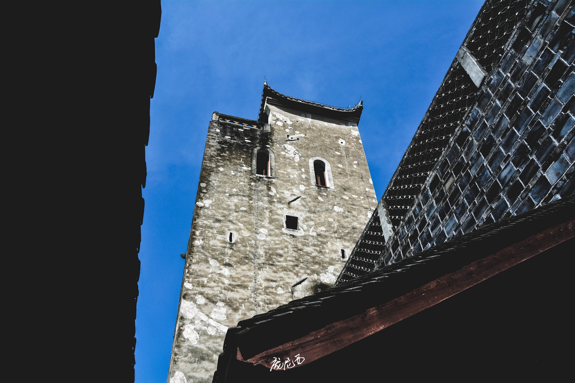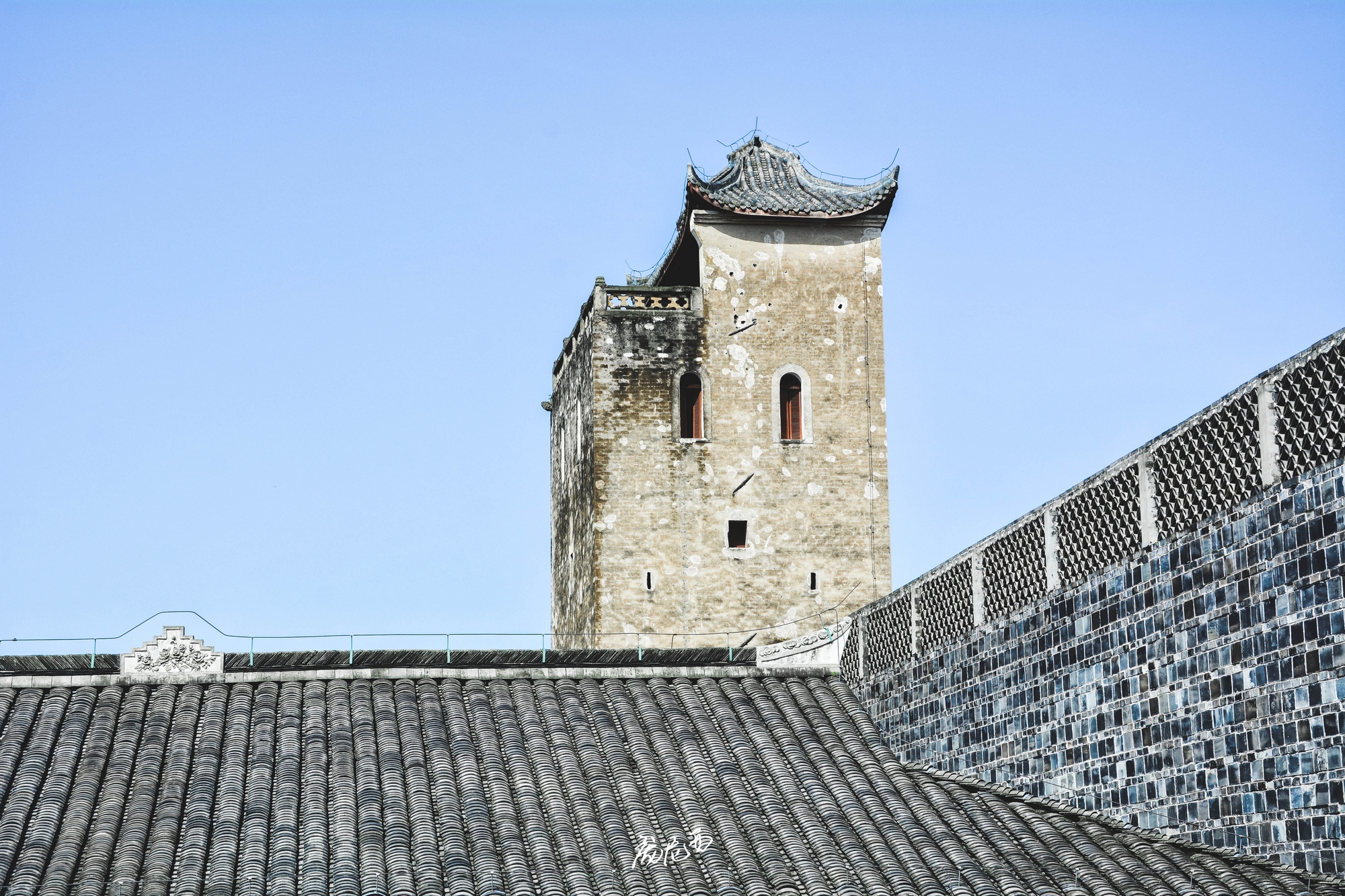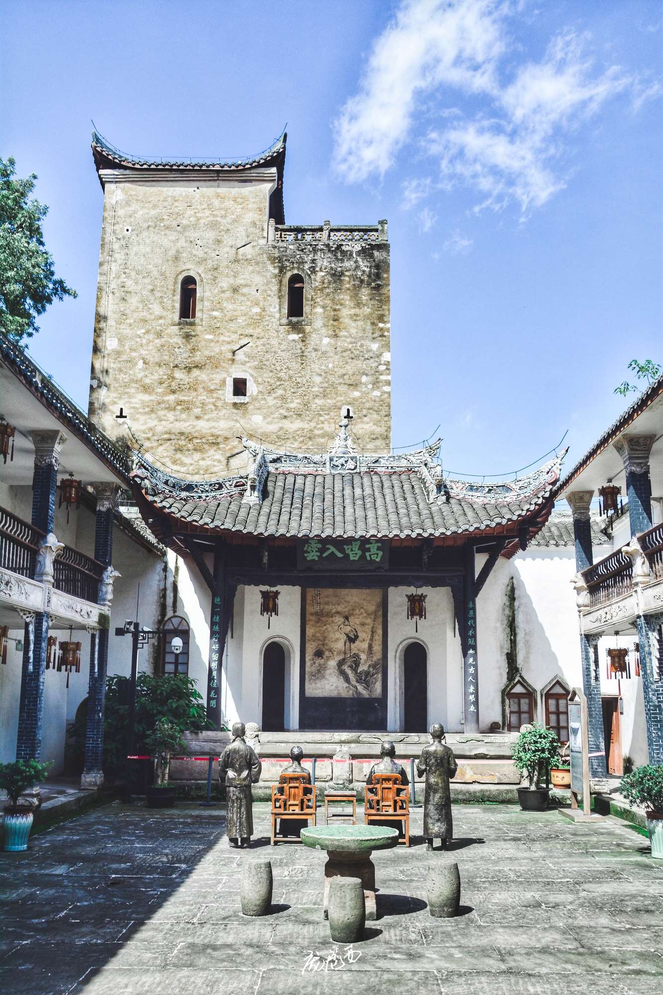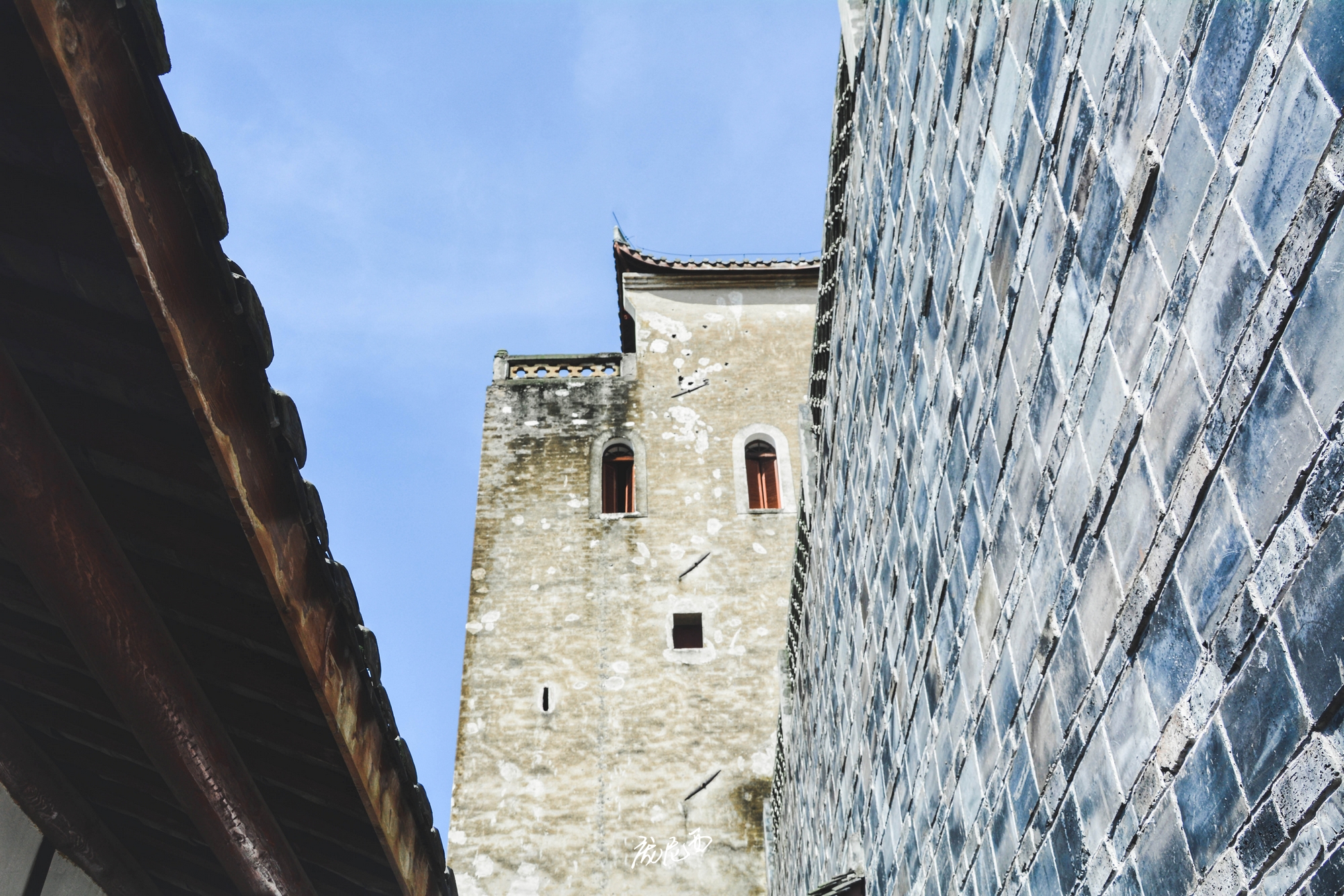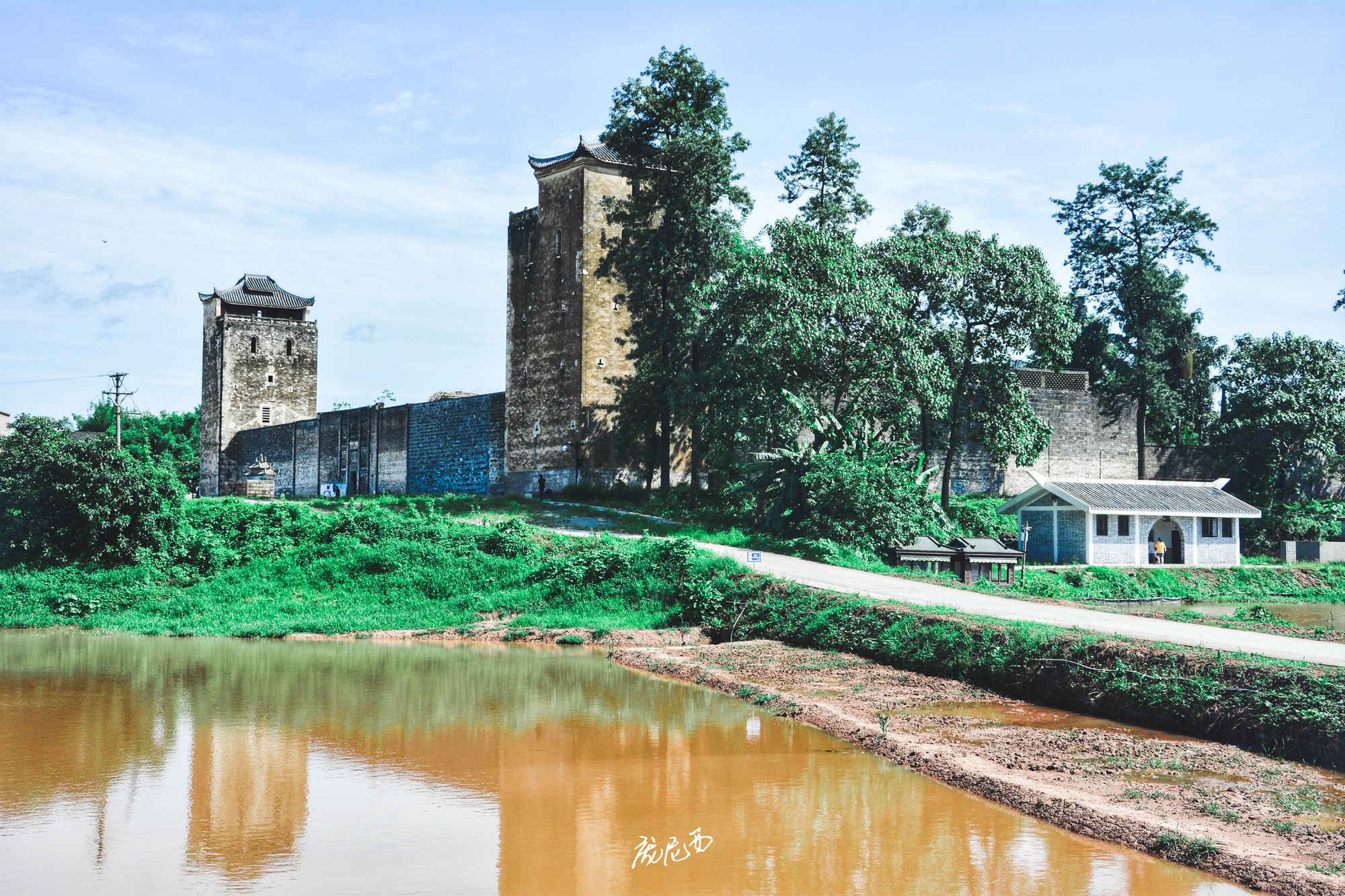 说实话,去之前对这个庄园是没有什么期待,毕竟同在川内的大邑刘氏庄园名气远在其之上,但是看到屈氏庄园的第一眼就被深深吸引了——这是一座高墙碉楼式的庄园,完全不像平时所见的院院相连的四合院民居风格,更像是福建的围屋+川西碉楼的综合体,当然围墙里面还是熟悉的川内民居风格。