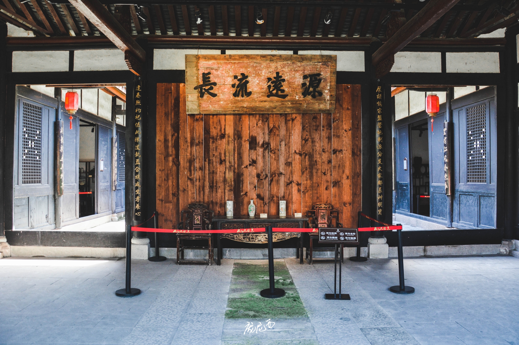 整个建筑群内设有大小花厅、天井48个,以装修精致的中堂为主,布局左右花厅、寝室、帐房、书房、厢房,室内外空间和谐优美,不能不感叹庄园主人在空间处理上的独具匠心,而它的布局正好凸显了清末民初四川地区的尊卑之礼、长幼之序、男女之别、内外之分等宗法伦理思想。