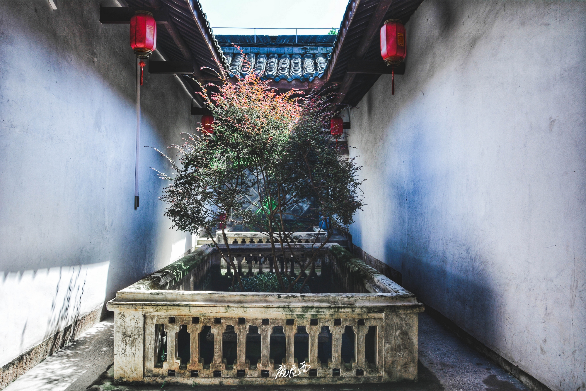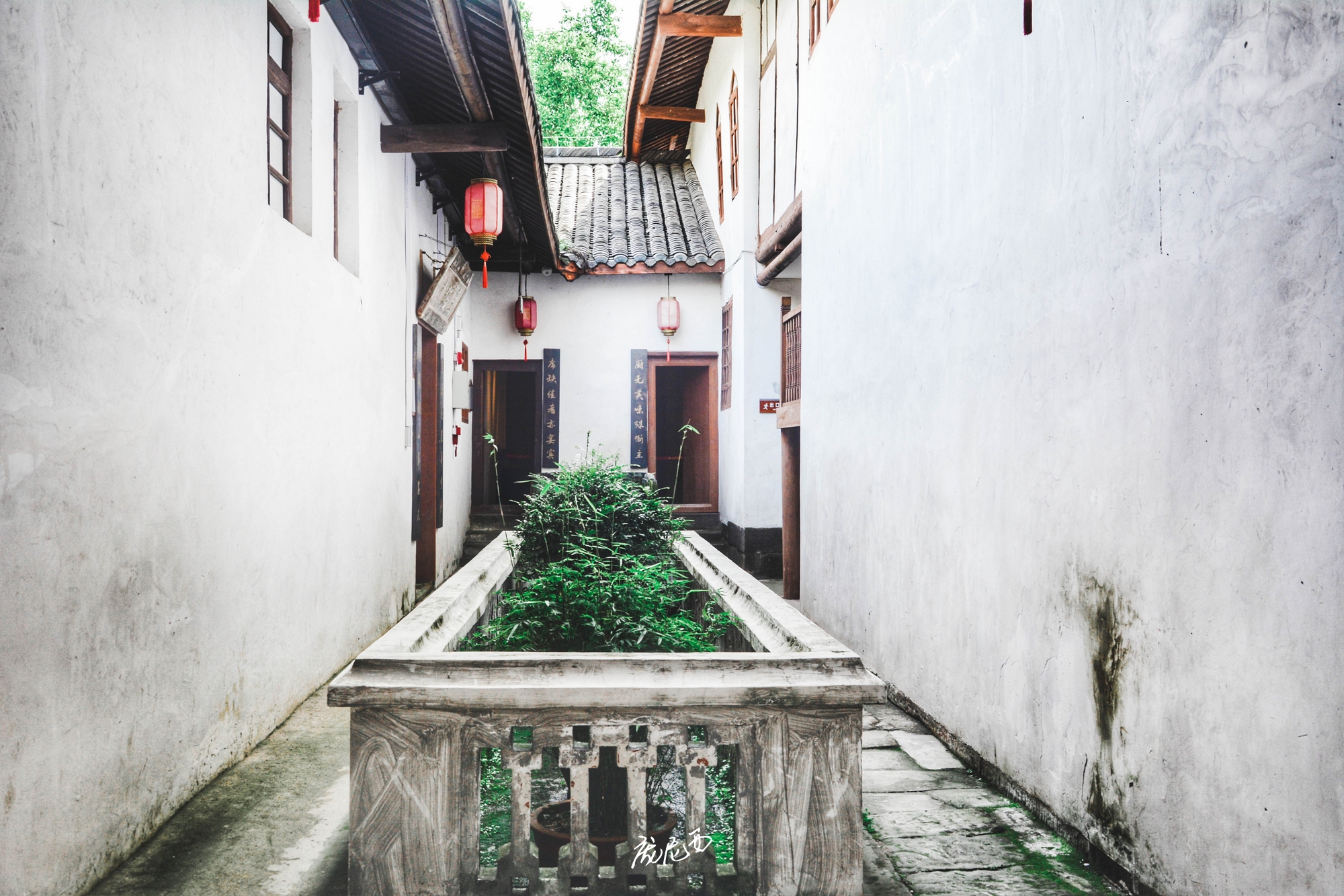 庄园内,道光年间修建的中心建筑群采取中轴线对称方式布局,内戏楼将西式的廊房和中式戏台组合,构成的整体轮廓舒展柔和而不失庄严;白墙、青砖、黛瓦,色调清新而淡雅;画栋雕梁、飞檐斗角,尽显巴蜀之地的婉约美和内敛气质。
