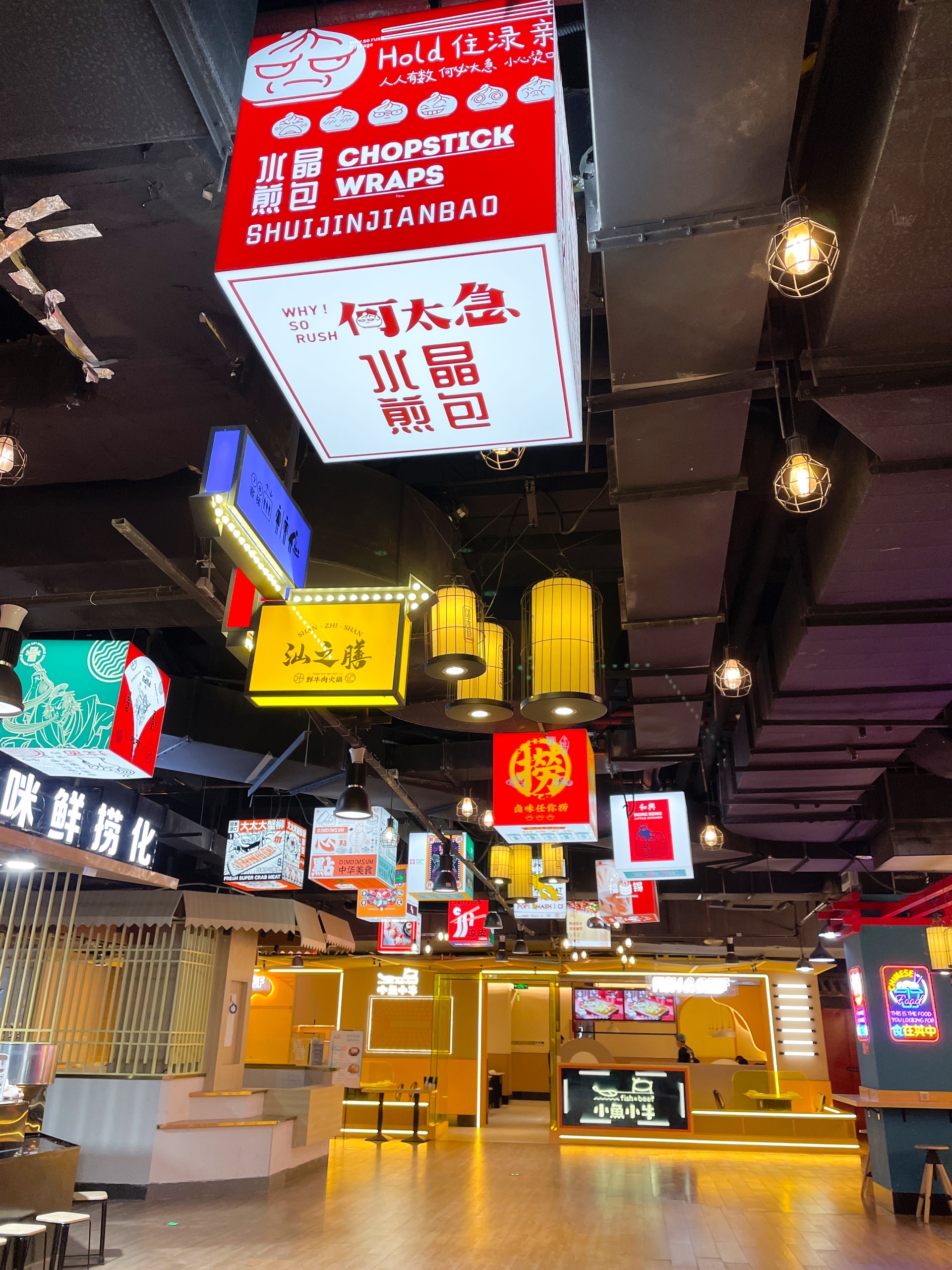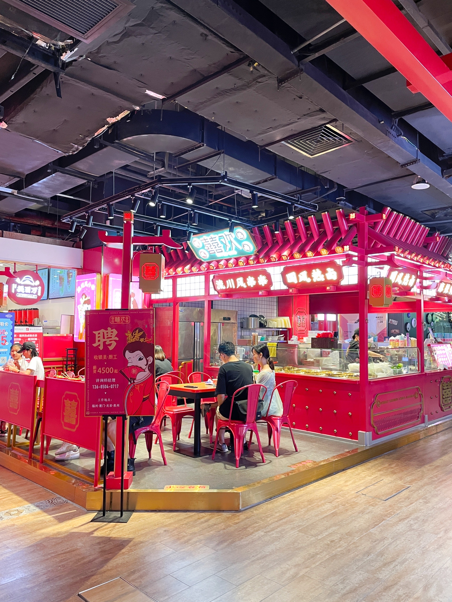 先逛了一圈发现美食餐厅有一品焖锅、鼎四方、雄逗逗、联丰源糖炒栗子、周公米线、汕之膳叶记牛肉火锅、珊珊粥铺、百调微醺WANADRINK、牧尚平价牛排、日烨燃、流川风、提百万、阿鲷鲷鱼烧、牛铺锅贴、阿甘锅盔、糯小米、囍欢......不过人气视乎不够,饭点时间游客倒是不多。