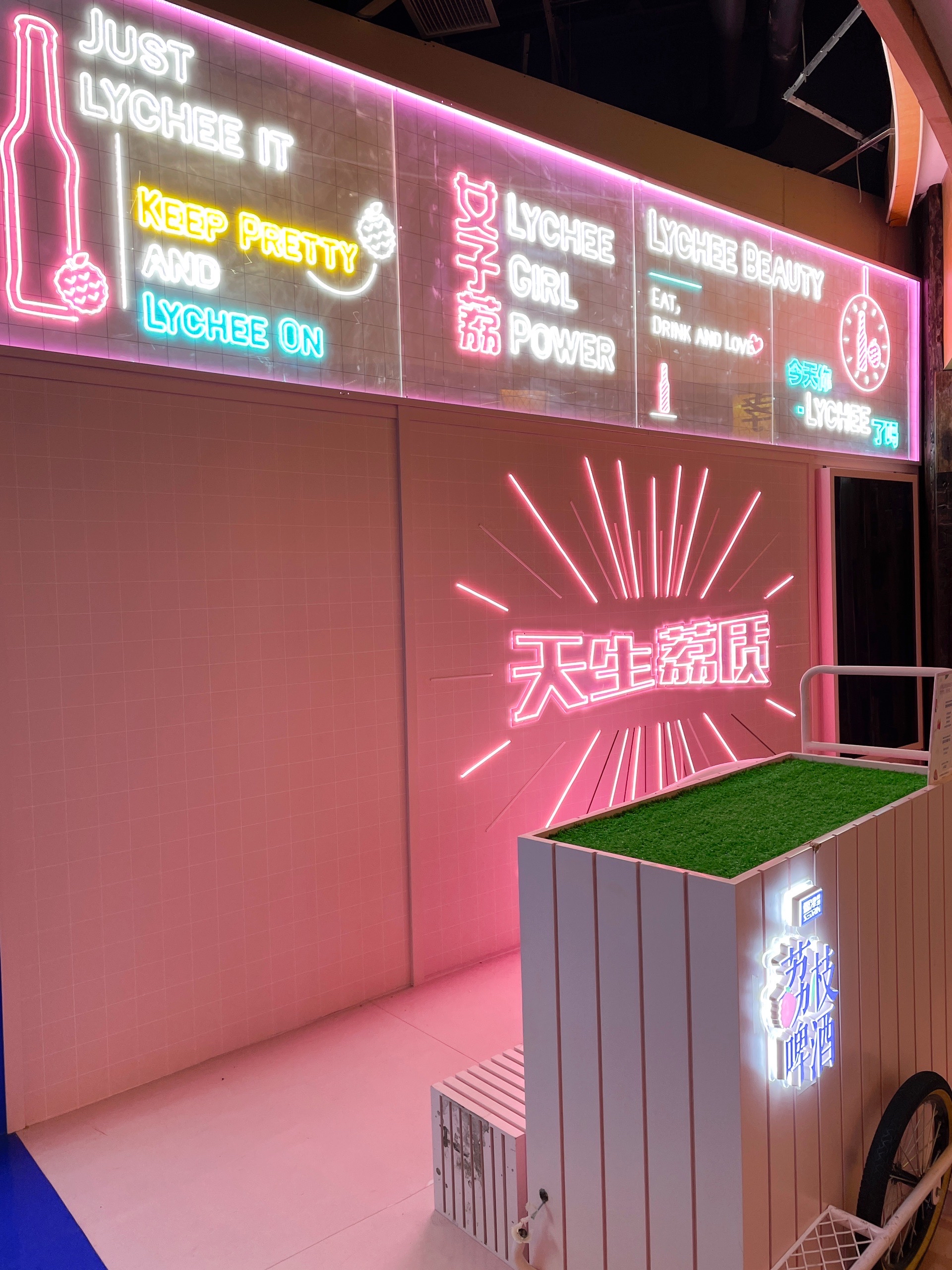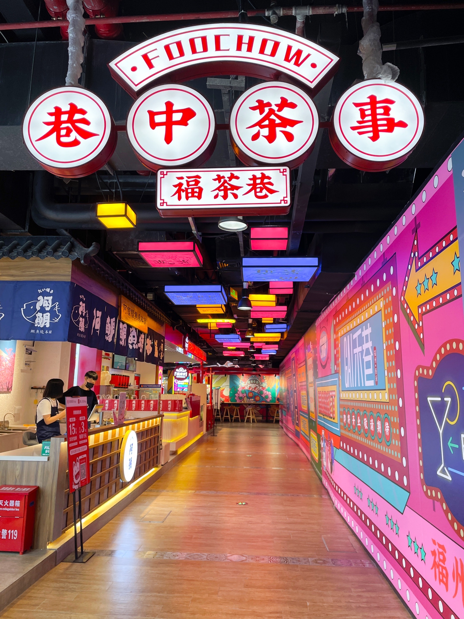 Gai禾巷应该是用了福州街巷文化的构想,以传统巷子的形式,加入国潮时尚元素。街区内引入霓虹灯式的招牌文化,五光十色的店招在亮灯后营造出市井烟火气,浓厚的上个世纪80年代老福州气息元素,打造一个复古怀旧的新潮打卡地。