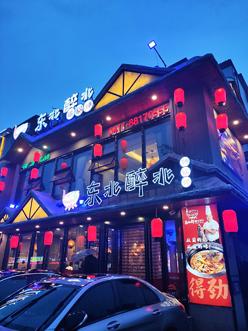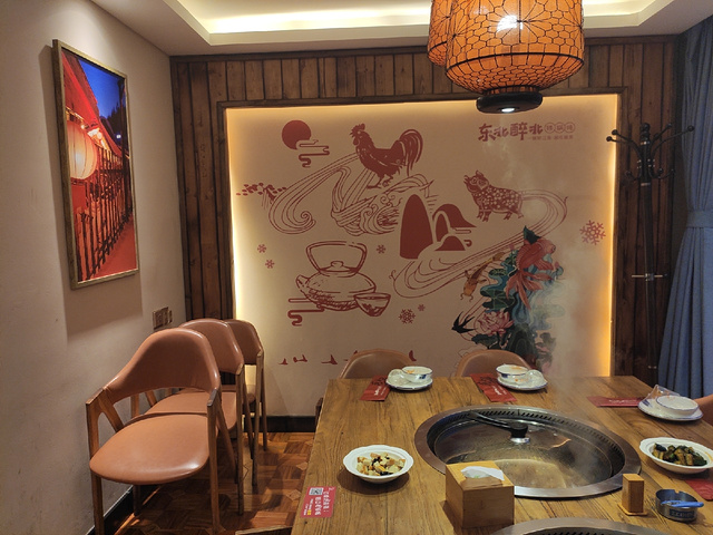 开在家附近的一家铁锅炖,挺有特色的。 名字有特色,装修也有特色,浓浓的东北风,雪景,灯笼,好像一下子就到了东北雪乡。 八个人,点了一个红毛大公鸡,一个鱼锅,感觉应该是够吃了,没想到旱涝不均,鸡锅早早就吃了了,鱼锅还剩了1/3,说明不管江鱼怎么好,还是肉更对东北人的胃口啊。 大锅炖的味道挺好,尤其是粉皮、粉条这种吃味儿的菜,吸足了汤汁,更抢手,爱吃的可以多加一份。小花卷很快也被一扫而光,饼子虽然和鱼锅更配,但是花卷的口感明显更受欢迎,爱吃的也要提前跟店里说加一份,人多的话一份肯定是不够。 炖一锅大概需要四十分钟左右,着急的可以提前打电话跟老板说先做上,这样到了就能吃。 说说缺点。 一是比较咸。东北菜口味普遍比较重,我也算是个口重的人,但是大酱的味道真的是很咸,可能这个也是鱼锅剩的比较多的原因。 二是餐具要两块钱一个人,收费正常,两块钱就有点儿很不讲究了。 三是众所周知的原因,这种大锅炖的环境就只能吃饭,没法唠嗑,所以霹雳噗噜很快就吃完散伙了,只适合家人朋友吃饭,不适合宴请和喝酒。当然了,这样的话翻台率比较高,店家肯定是欢迎的。 整体上来说还算不错,就这个位置来说,性价比比较高,可以来吃吃,但是真正想吃铁锅炖鱼,我还是推荐老六。 其实本来我是想给三颗星的,因为前台结账那个小伙真的让我很不爽,但是前台的大姐挽救了这条点评,从订餐到用餐,到服务到送客,他真正做到了让我无可挑剔,为她加一颗星,为她还会再来。 至于朋友们你们来不来,就看自己这顿饭需要怎么吃了,希望这条评论对你们有帮助。