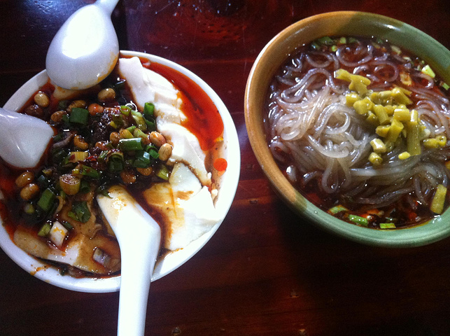 小吃很多,叶儿耙挺香,凉糕和发糕类似,豆花和凉粉都超辣。这边镇上卖腊肉和香肠的要比成都市内的便宜很多,应该是因为大多是自家制的吧,还有很多卖辣酱、腐乳、汤麻饼的。