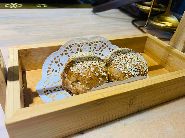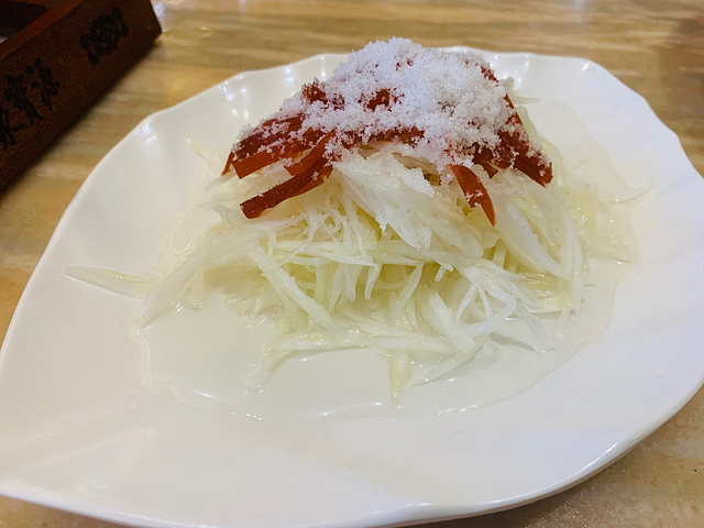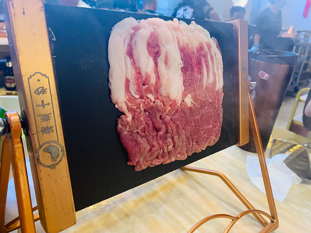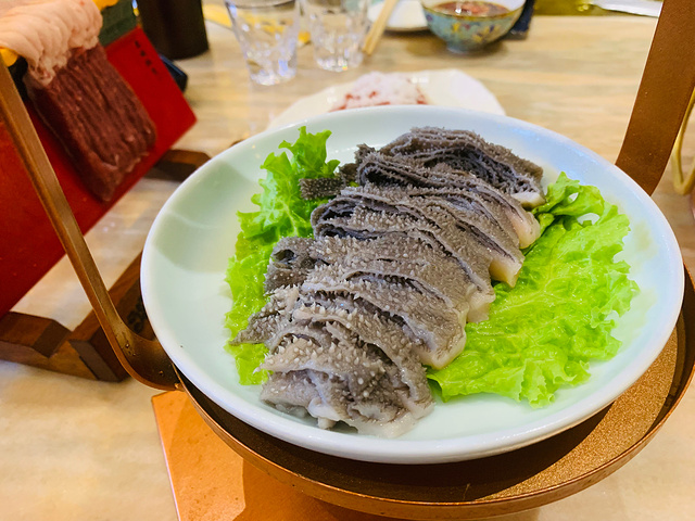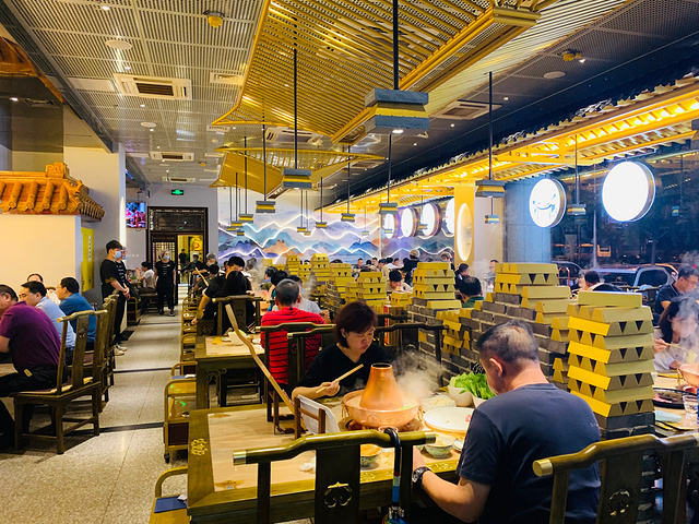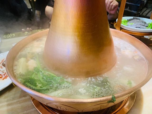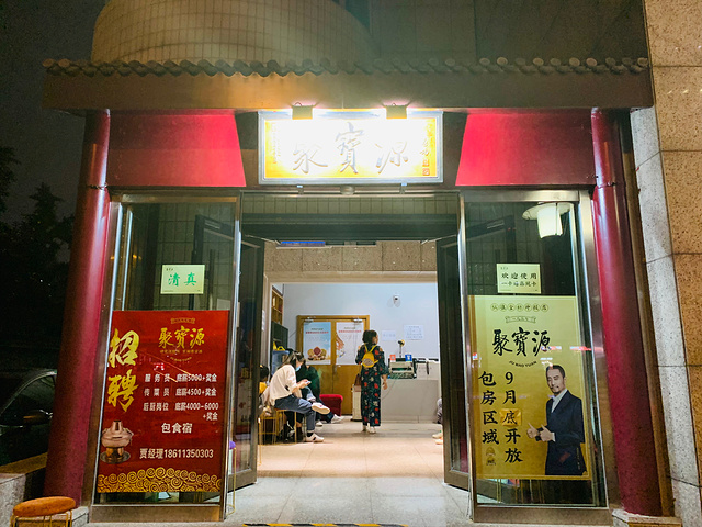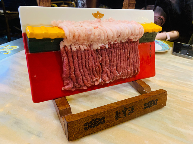 这家应该是家新店,去的那天在地图软件上还搜不到,因此是按着大众点评的地图索引找到的。因为提前打过电话预约,知道这家店很火,排队时间很长,因此也做足了心里准备。到了这里的时候果然门口已经有不少等位的食客,里边更是顾客满满当当,热火朝天的。我们排队拿号后发现店家很体贴,排号单上写着如果等位超过40分钟会送一个凉菜,另外门口等位区还有免费小吃和水,让大家先垫垫肚子。 等了大概50分钟左右,终于轮到我们了,前胸贴后背的我们迅速点餐,除了双人套餐之外,还点了很多特色菜品。京城飘雪是它家的王牌,肉里水分极少,紧贴在双面餐盘上,无论怎么翻转都不会掉下来,送上来的时候还着实让我好奇了一阵;精品鲜毛肚和精品肥牛也不错,小吊梨汤浓度刚好,不淡不腻;必须强烈推荐的是,这家的烧饼真的很好吃,一定要尝尝。 门店的装修很有特点,中间两列餐桌之间齐整整地裸着一个个大“金砖”加上整个店里金黄色的桌椅和内饰,让整家店金光闪闪,蓬荜生辉。餐厅的前台很热情,服务员大多是上年龄的阿姨,有的看着应该是刚来的,还有些业务不熟练,不过餐厅经理很干练,迅速解决。 整体看,这家店延续了聚宝源的优良传统,在菜品上做到精益求精,服务也很热情,地理位置也很黄金,门口就有停车位,附近也有很多公交车站,无论是自驾还是坐公交都很方便。价格算中上,值得来尝尝,就是要把控好时间,黄金时间来要做好等很久的准备。