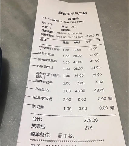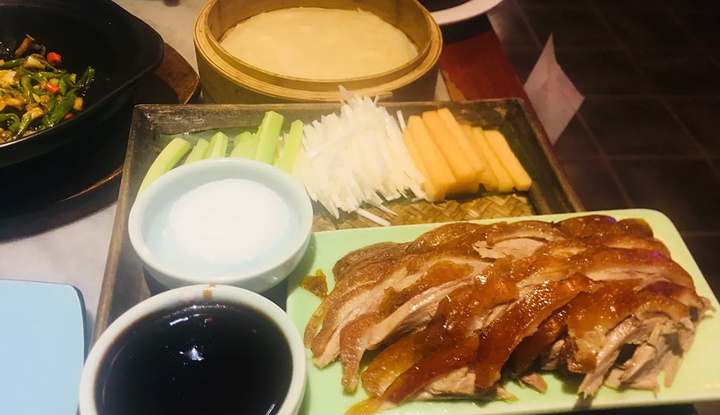 这家局气位于西单太仆寺街 直接坐车到西单溜达过去就可以了 虽然一直就知道这家局气 但苦于他家排号的人实在是太多太多了所以这次是第一次来他家 下午大概五点到的 排号的人依然很多 但报过是霸王餐之后居然让我们直接进去了哈哈 感谢感谢 另外要是选择霸王餐中的烤鸭的话 需要提前到前台说一下 (他家的烤鸭都是现烤现卖的[色] ) 另外在菜品上来之前还很贴心的赠送了酸奶和豌豆黄 【局气烤鸭】由于是现烤的 所以吃起来格外的香 黄瓜薄饼甜面酱也给的很充足 【兔爷土豆泥】很大的一块土豆泥 中间还有陷 很可口 【砂锅扁豆丝】这个本来是大众点评里三选一随便选的 但是菜上来之后真的是给了个很大的惊喜 非常非常好吃 还不像干煸扁豆油那么大[强] 【局气炒饭】选的新款的腊肉炒饭 因为别的菜量很大 所以炒饭就尝了几口打包带走了 虽然味道也不错但是感觉没有水果局气炒饭好吃 【小吊梨汤】用小暖壶装的 味道淡淡的 喝着很润口 在用完餐之后服务员还赠送了果盘 服务什么的真是没的说哈哈 总之是一次很不错的霸王餐体验 下次赶上排号不那么多还会再来
