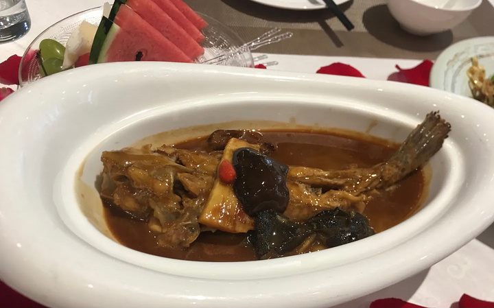 这家店位于通州运河边上 需要提前预约下 一路跟着导航过来还算好找 就是最后需要穿一个小区 门口有不少车位 停车还算方便 一进门报了手机号便由服务员带领着来到了约好的位置 恰好正赶上520 桌子上有用花瓣拼成的520字样 很有新意 扫完霸王餐码就等着上菜了 上菜速度很快 不一会就陆续全上齐了 霸王餐量很大足够四个人吃 【原生态西施鱼】很入味 鱼吃完之后把米饭🍚往鱼汤里一扣 那叫一个香[吐舌] 【煎豆皮】凉菜 微辣 很好吃 【茶香自然炒烤羊肉】羊肉和茶一起炒 肉很嫩并伴有弄弄的茶香 【杏鲍菇炒牛柳】嫩滑可口很下饭 【脆皮饼】很是酥脆 里面有陷儿 【纹丝豆腐】汤类 豆腐切成花状 汤咸蛋适中 很好喝 总的来说是一次很满意的霸王餐体验 无论从菜品还是服务都很不错 下次有机会还会再来