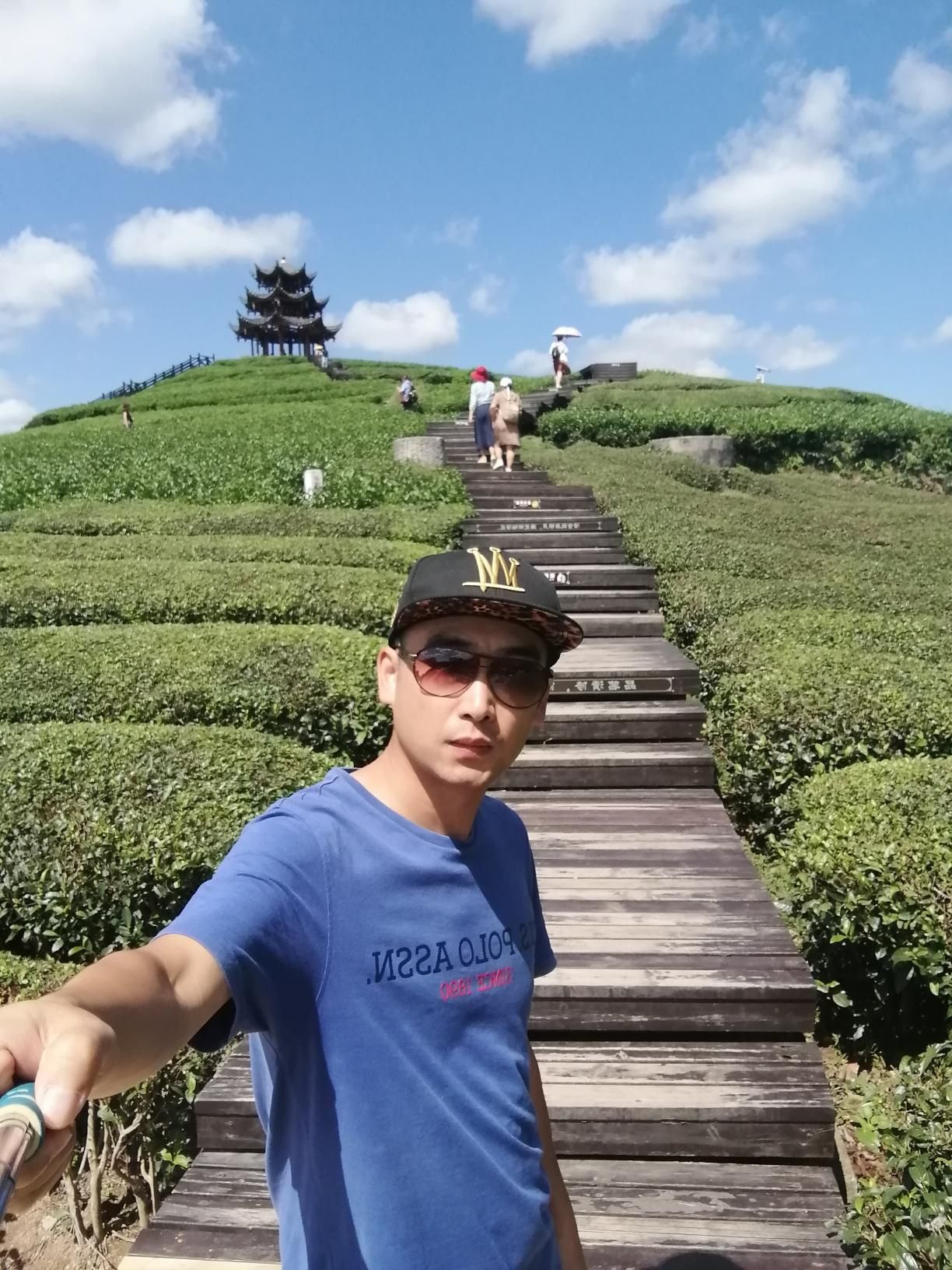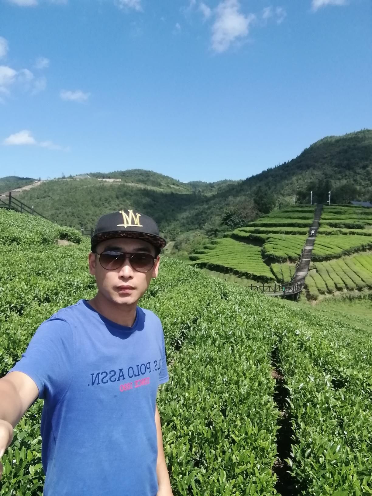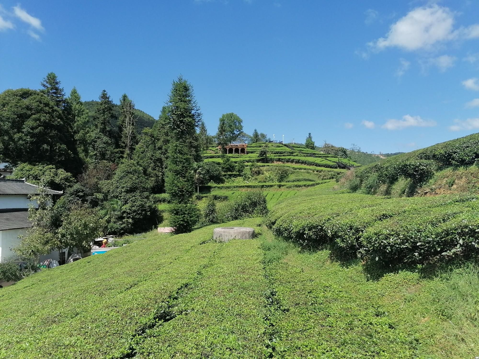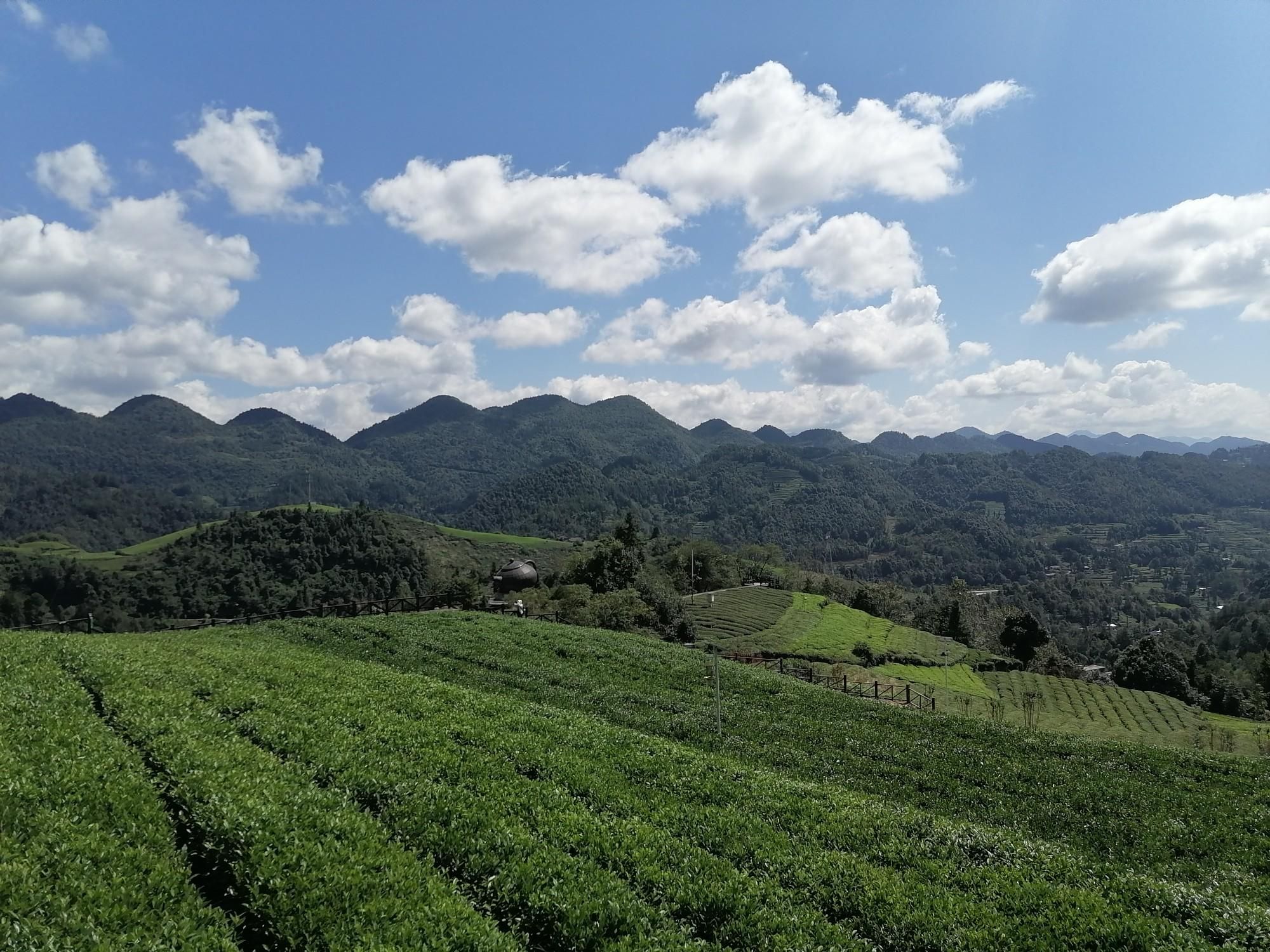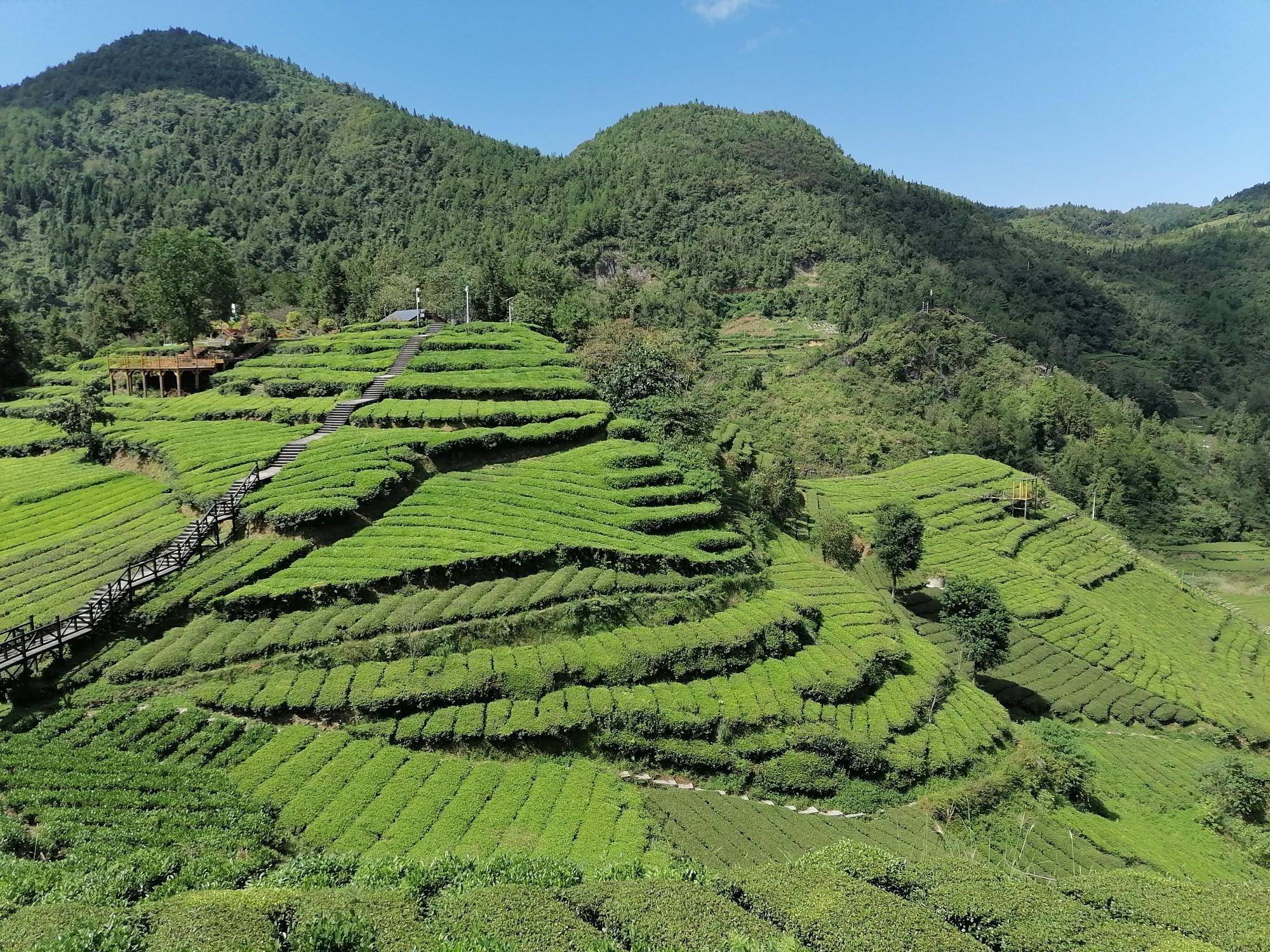 周遭的矮矮浅丘和瓷蓝底色的天空飘着薄薄的白云,看着远处的茶园一层层;层叠有序的梯田,曲折蜿蜒的田间小路,几条木栈道贯通相连着田间茶园,加快脚步急切的要融入这乡间的田野画卷。