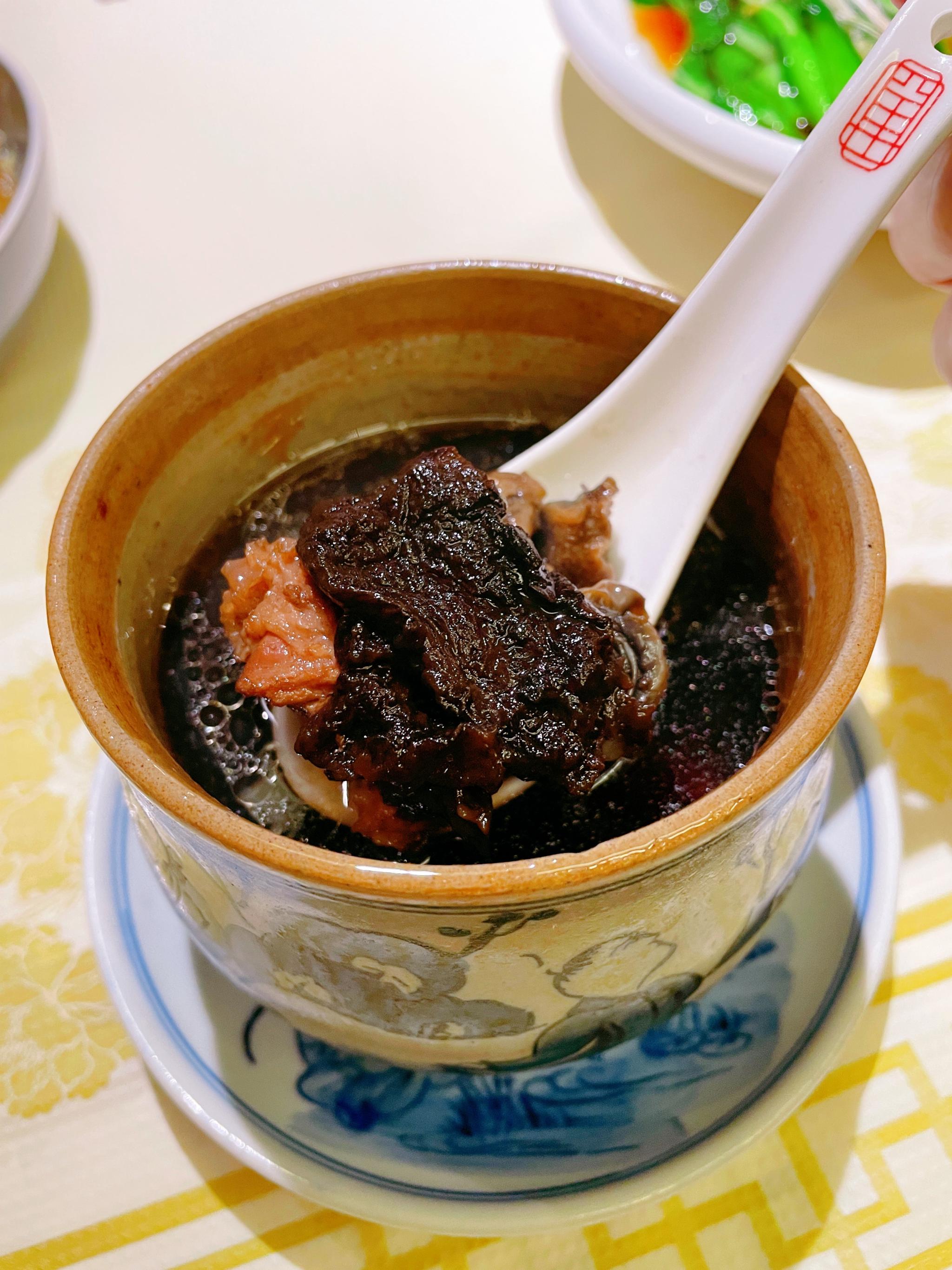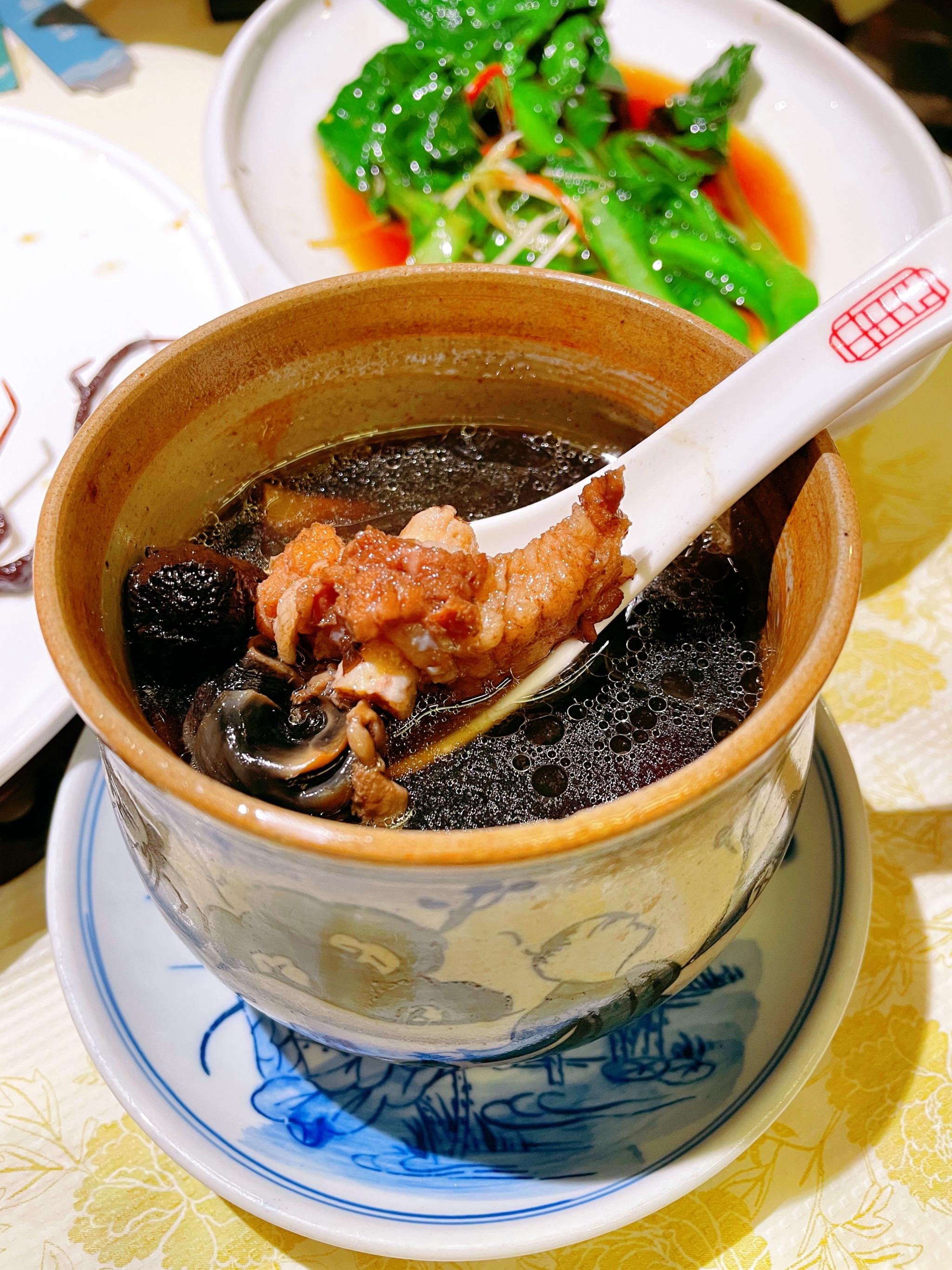 菜脯螺头炖排骨,一人一小盅的炖品,份量刚刚好,汤里有几块排骨和螺肉,热腾腾中汤品清甜,炖品必备。
