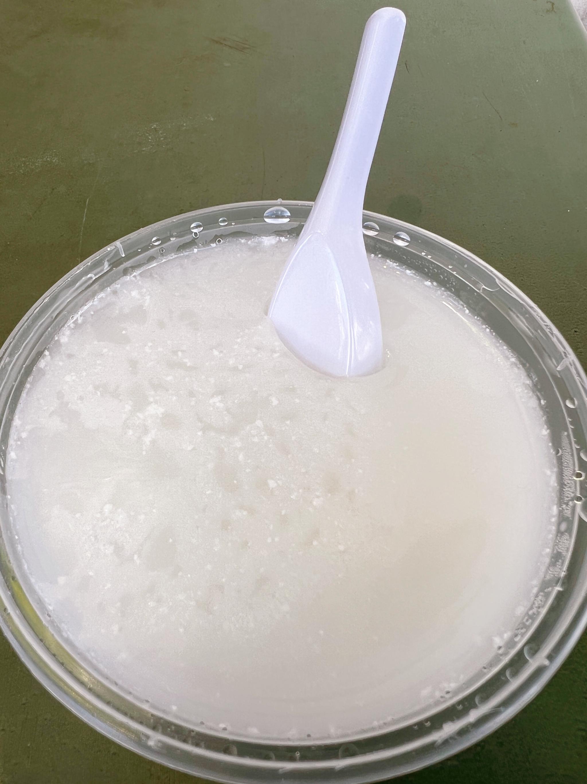 椰子冻,一小杯,呈半透明状,很像双皮奶,但是真真切切的椰子冻,果胶状椰子冻非常嫩,很Q弹,满满的纯椰子水淡淡香味。