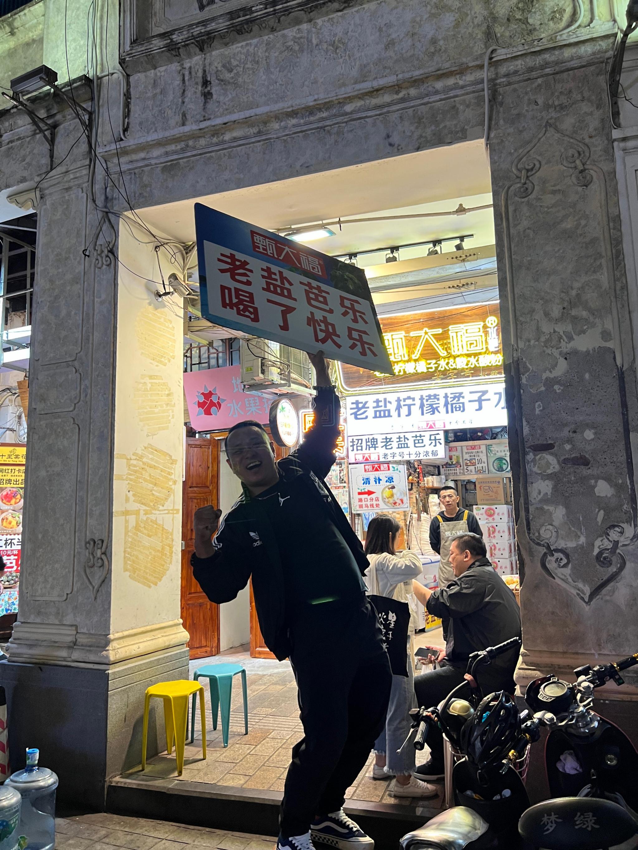 其实它们家还主打陵水酸粉,有招牌和沙虫两种。没有人能够抵挡得住芭乐独有的热带水果香气,加上老盐,恰到好处的搭配。特别是老板很热情很卖力,简直是让这家店成为网红的主要原因,他才是镇店之宝。过来时,远远就看见不少本地人或游客在买老盐系列饮品,更多的人是在现场拍照打卡或拍老板抖音视频。