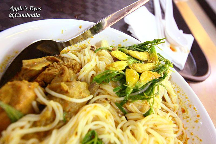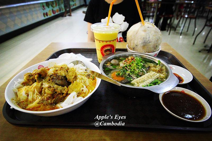 天气实在太热,晚饭没有选择市场附近的大排档火锅(虽然很貌似不错,超级多当地人吃),钻进了中央市场附近的SOYRA SHOPPING MALL楼上的美食广场。美食广场选择多,明码标价,物美价廉。单独的店铺,不用现金结账,要买餐券。吃不完的券,可以退回现金。左边黄色那碗,高棉咖喱捞米粉。吃不出和其他咖喱有什么不同,配牛内脏,我爱咖喱,很好吃。右边牛丸杂锦河粉,配了一个海鲜酱吃。味道还可以吧。(但是一离开越南,我就转投高棉菜的怀抱了,对于河粉什么的没有强烈感觉。)芒果冰沙+新鲜椰子,我和灰灰两人在东南亚最爱的饮料组合。这一顿大概7美金。