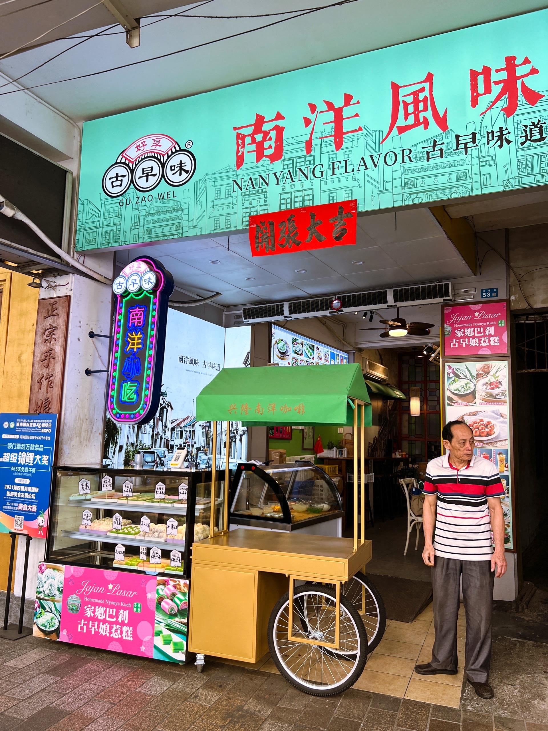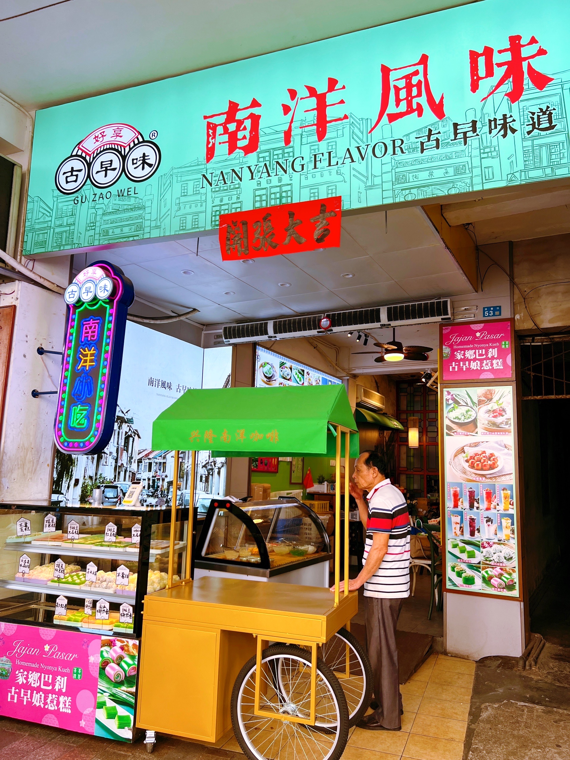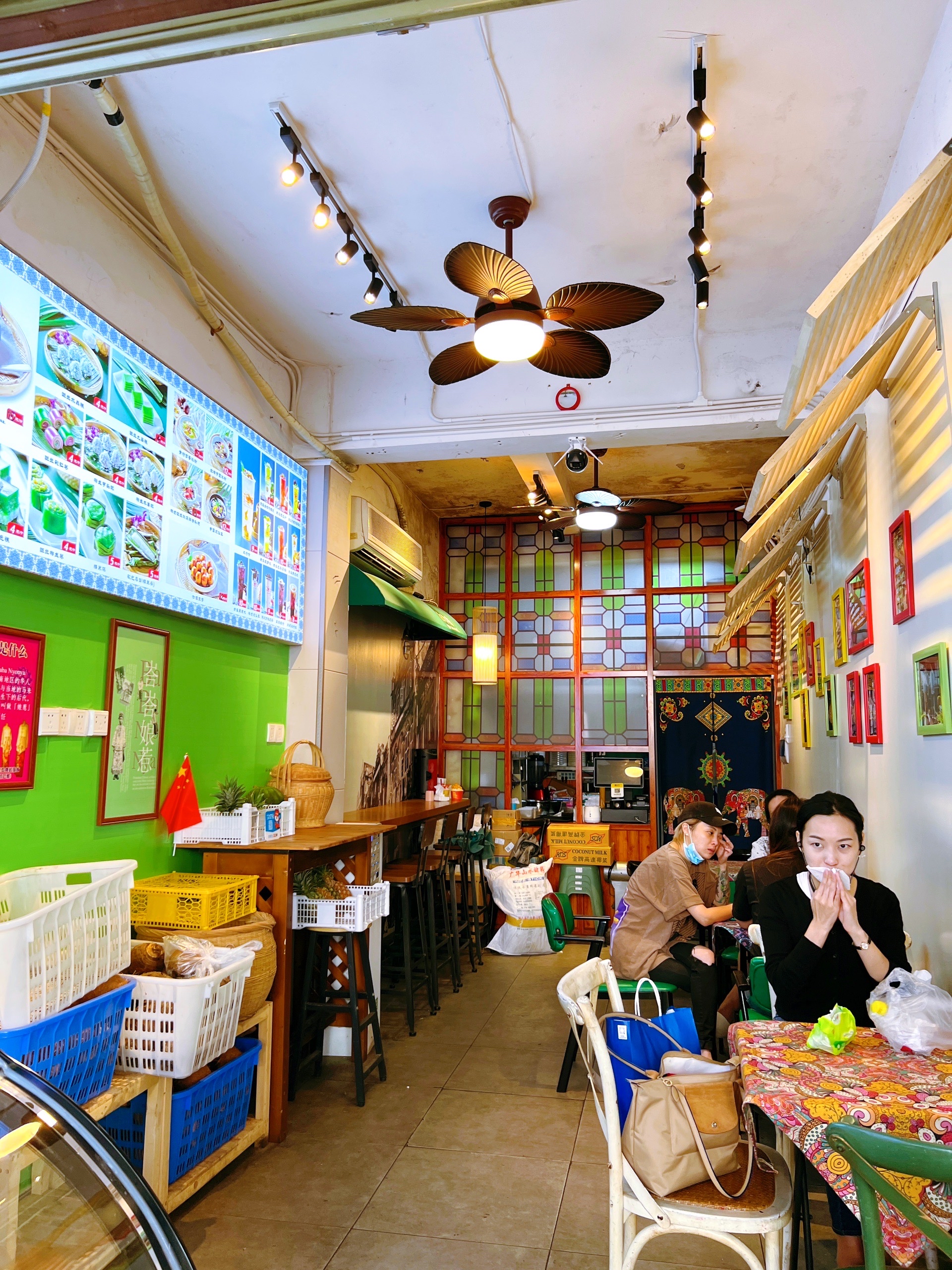 它家门面很小,真的如果不是那古早味南洋风味的招牌,一般会错过。门口老板已摆好的特色推车的柜台,店内南洋风格装修,只有3张小桌,1个小台,早坐满了用餐的人。