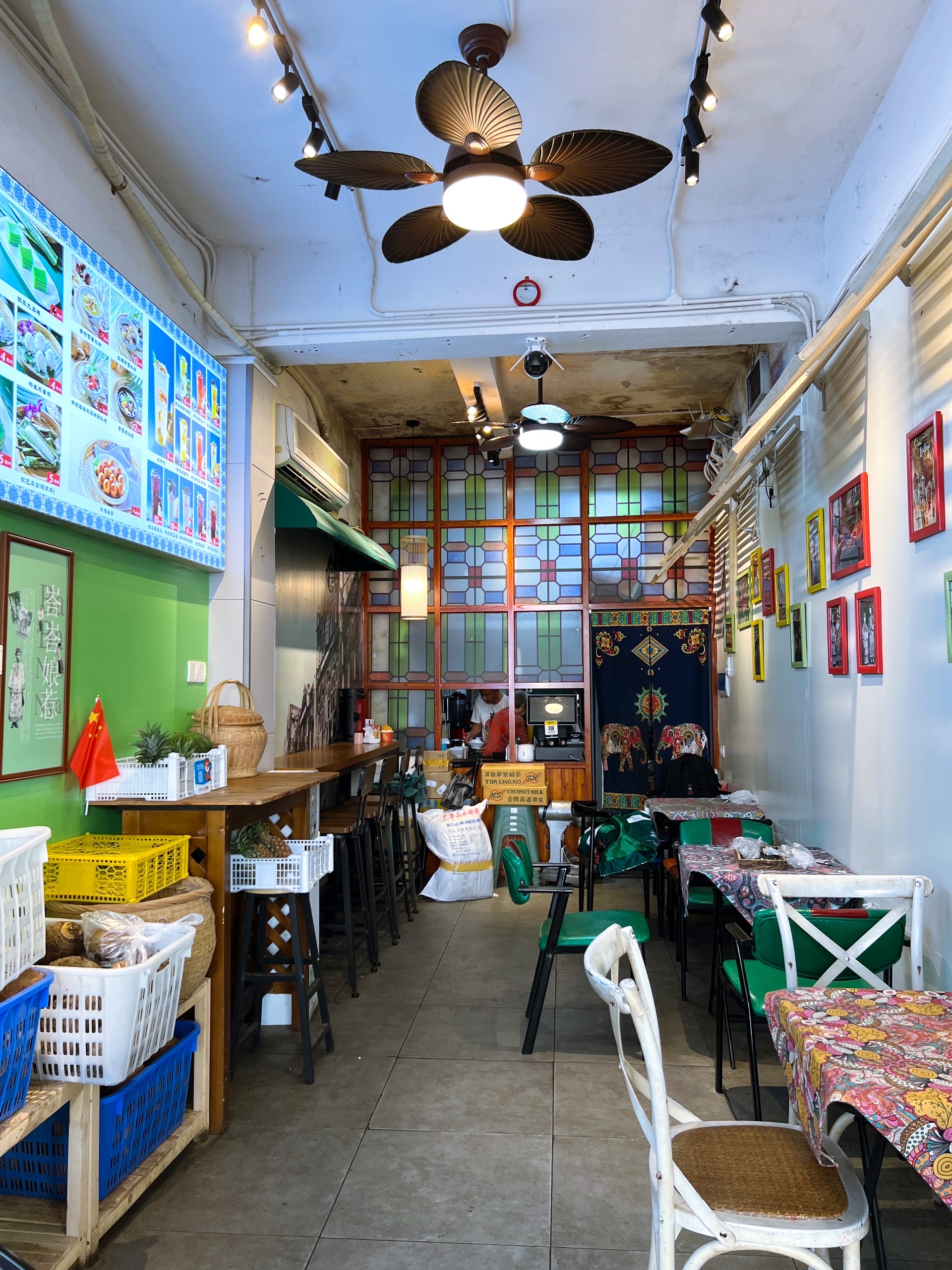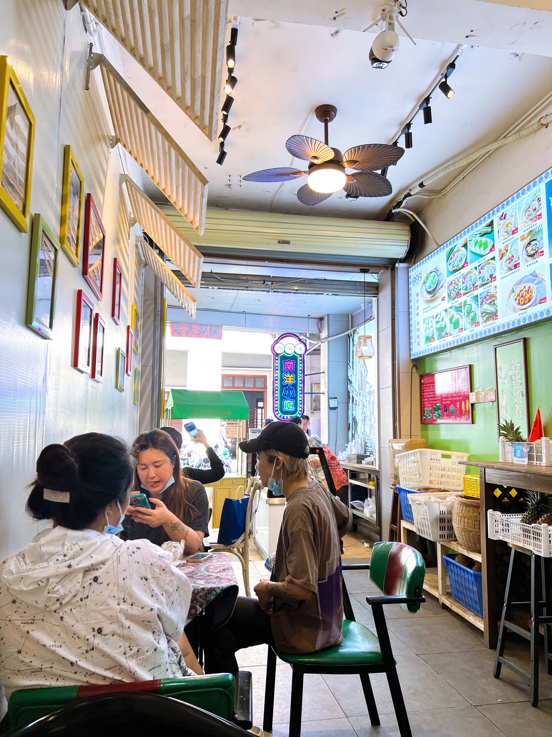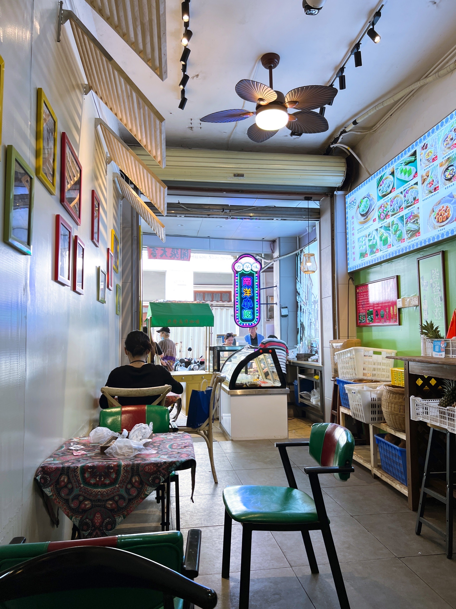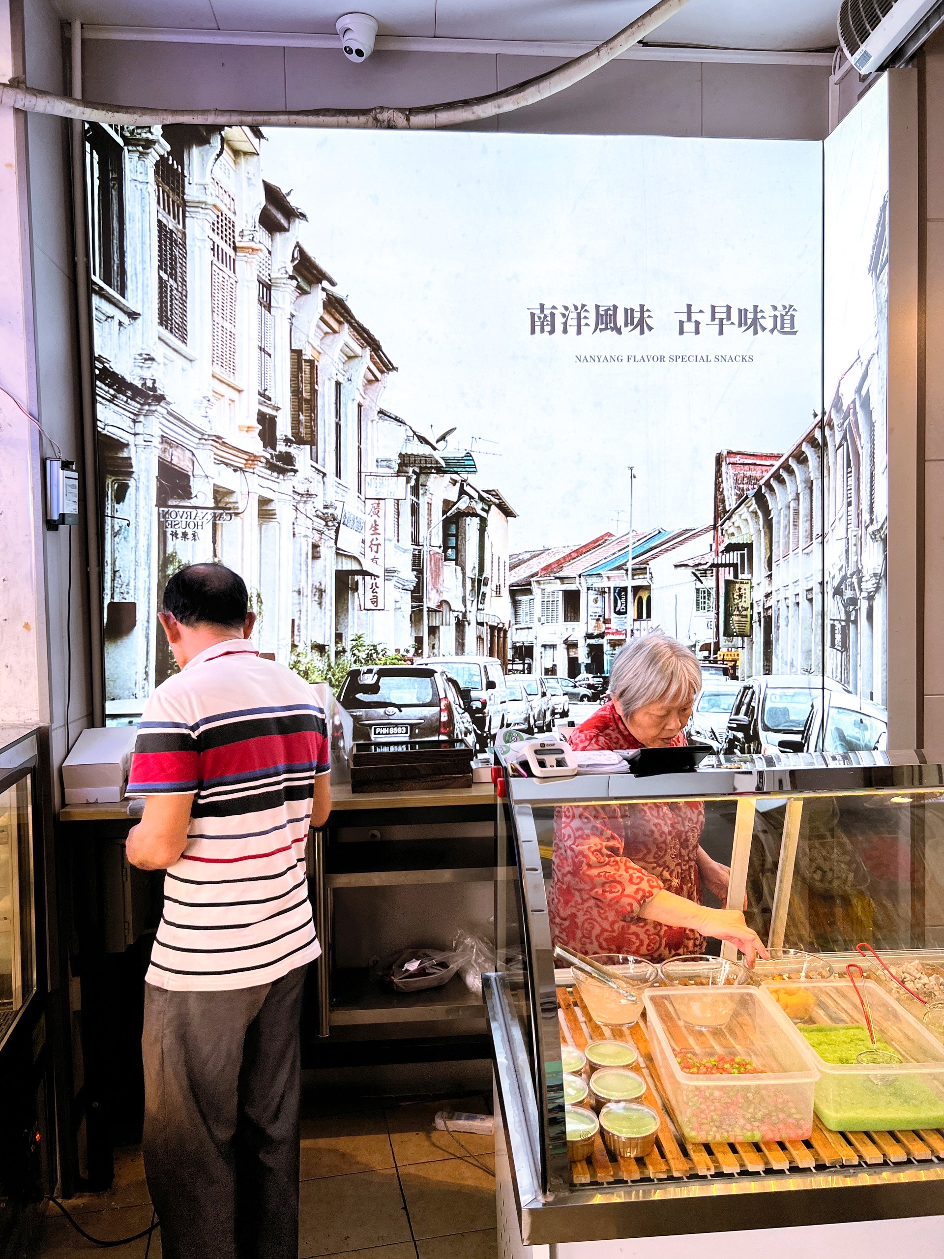 它家门面很小,真的如果不是那古早味南洋风味的招牌,一般会错过。门口老板已摆好的特色推车的柜台,店内南洋风格装修,只有3张小桌,1个小台,早坐满了用餐的人。