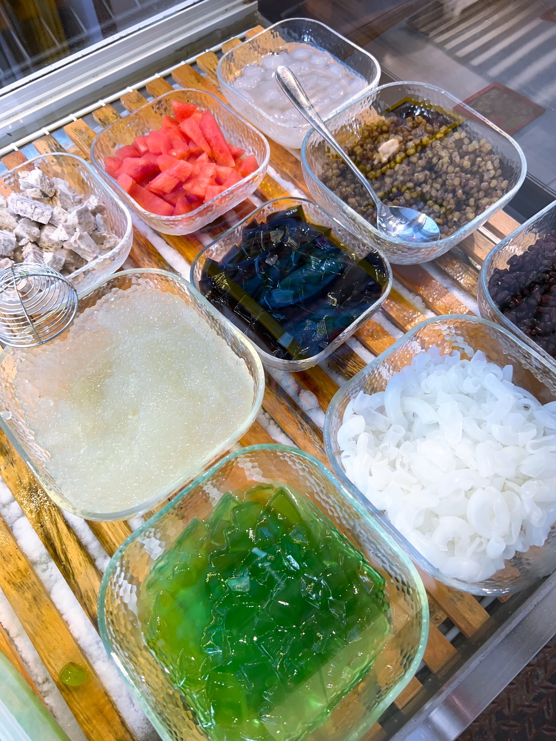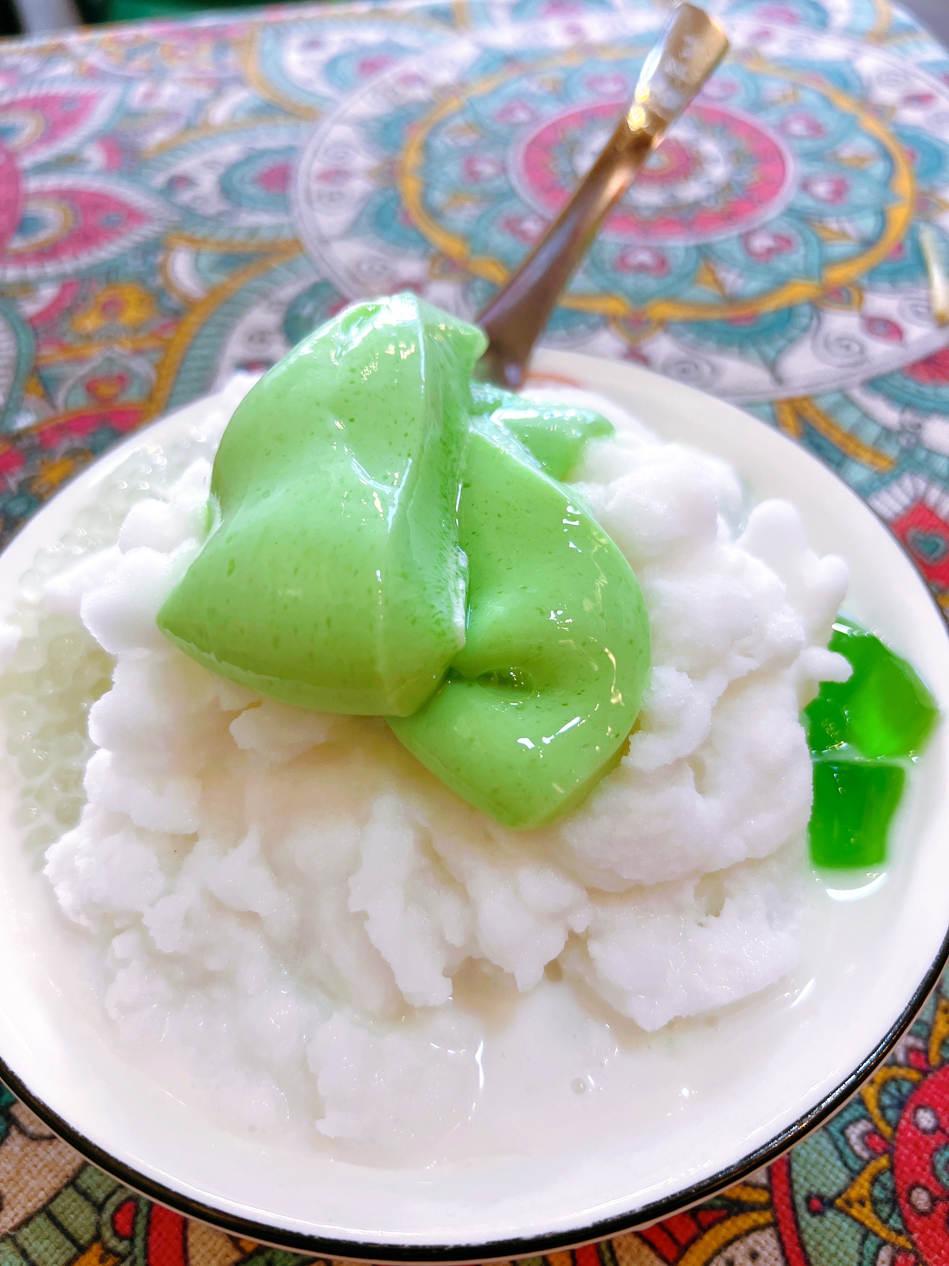 斑斓椰奶饺滑,它家招牌,好大一碗,下面垫的是椰奶冰沙和西米露,上面绿色类似布丁,是浅浅的讨喜绿,边角点缀深绿色也是布丁类,口感很像海南的清补凉中添加了冰沙,据说这是南洋风味斑斓的集大成之作。不过这道是冰的哦,不是热的。