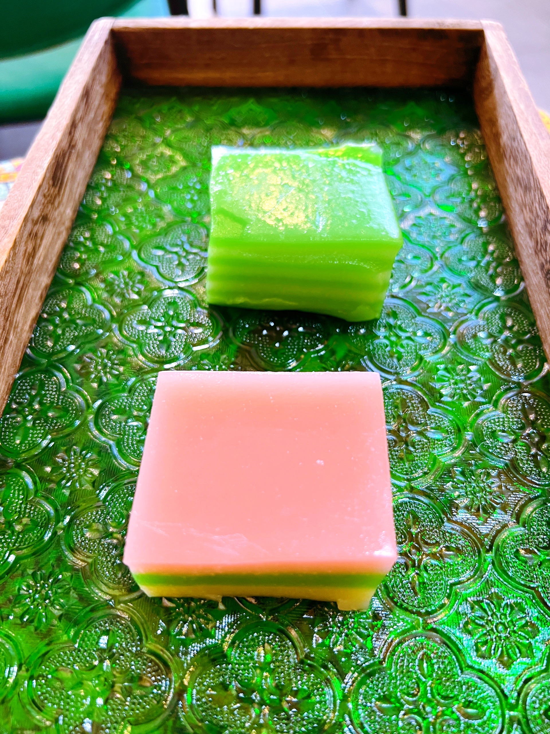 ...能东南亚很多福建后裔吧,糕点五彩斑斓,再摆放在店内特有绿玻璃底的盛皿内,十分勾起食欲,也很好看