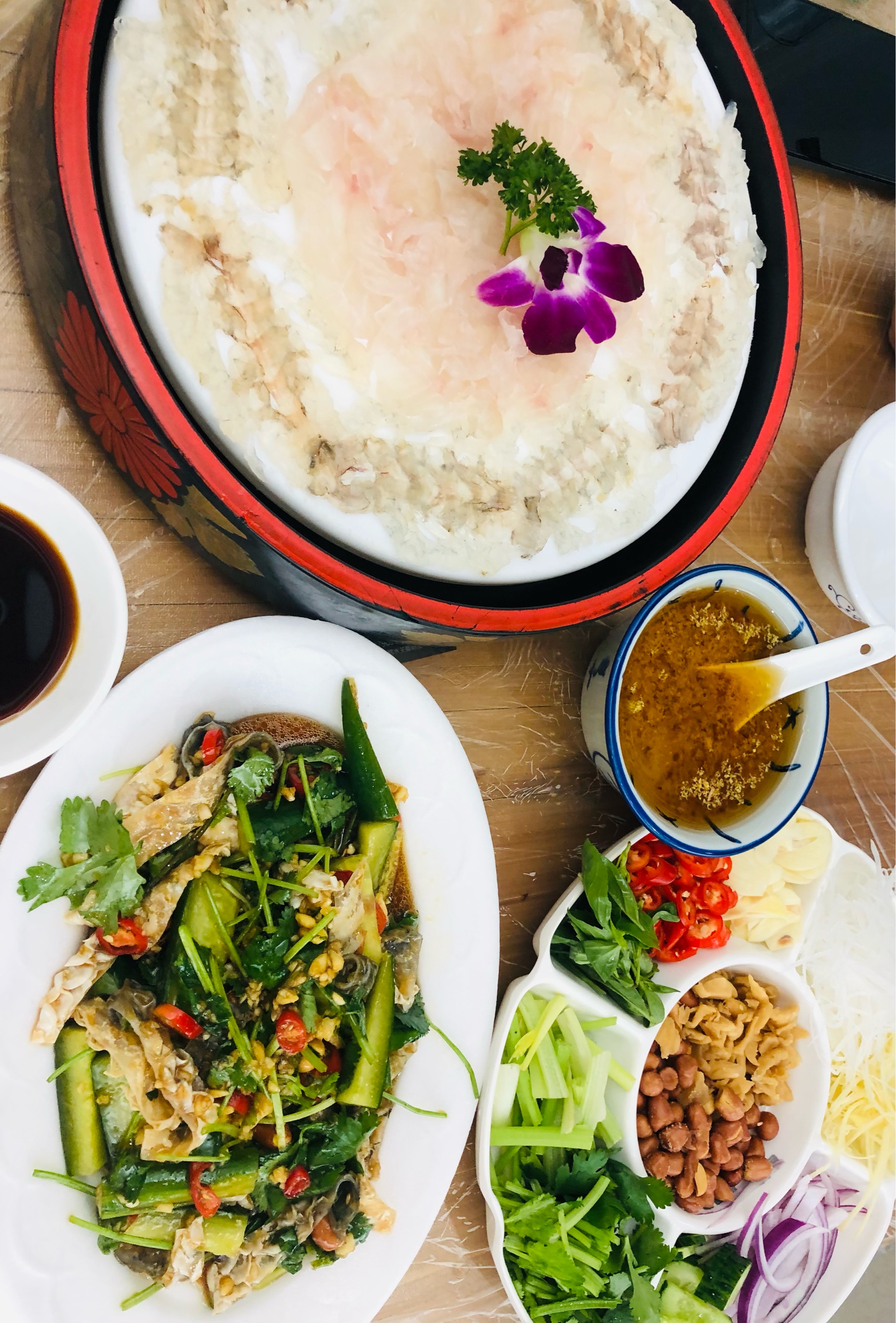 潮州的鱼生还是很有名,这次点了个双人套餐:鱼生虾生双拼+凉拌鱼皮+紫菜牛筋丸,很实惠!