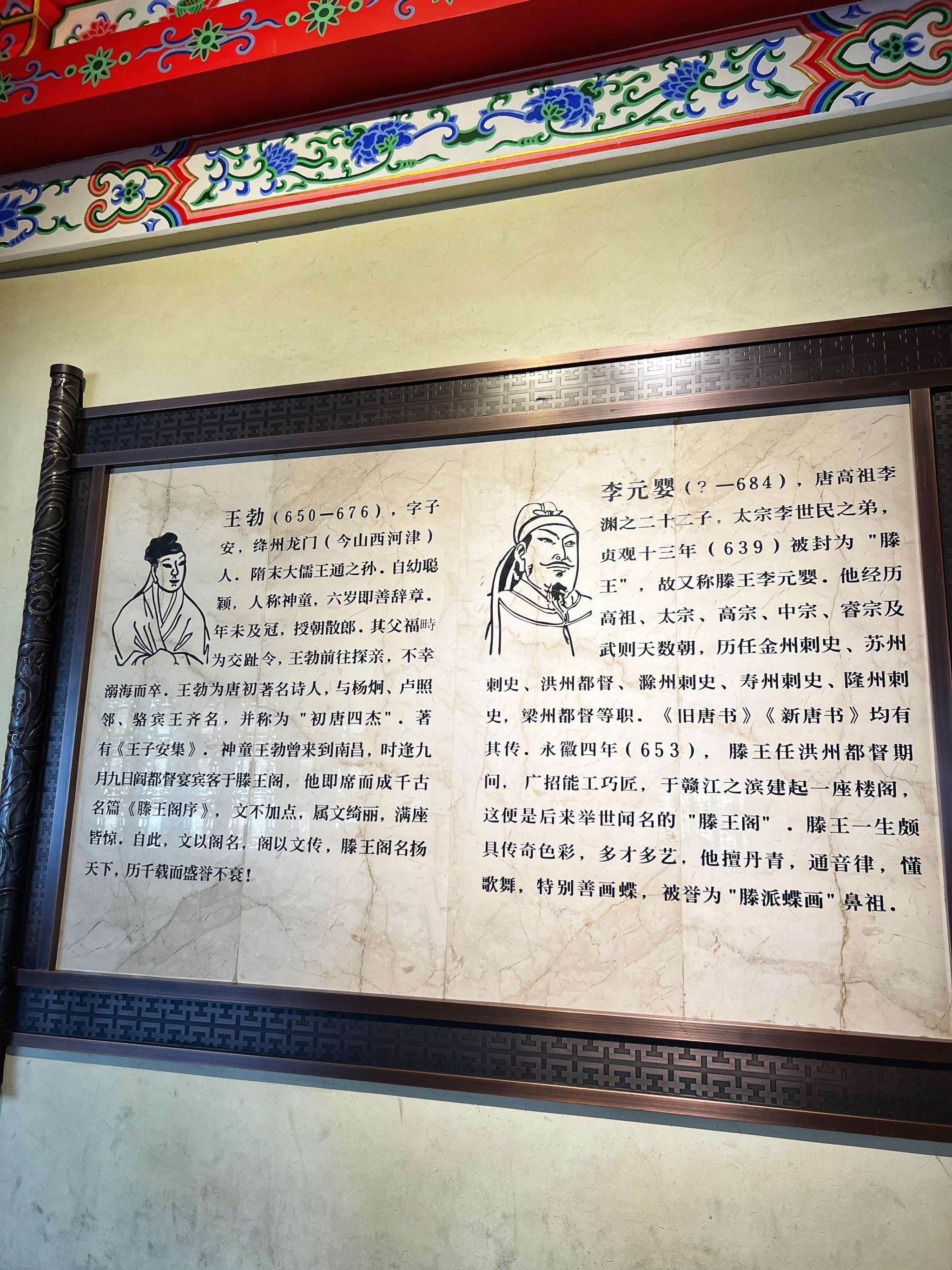 看一层铭牌介绍滕王阁历史:滕王阁,建于唐永徽四年(653年),它是唐高祖李渊之子李元婴任洪州都督时创建的。因李元婴在贞观年间曾被封为滕王,故阁以“滕王”冠名之。滕王阁后几经兴废,重建高达29次,为历代封建士大夫们迎送和宴请宾客之处。它之所以享有巨大名声,很大程度上归功于一篇脍炙人口的古诗《滕王阁序》。传说当时“初唐四杰”之一的文学家王勃探亲路过南昌城,正赶上阎都督重修滕王阁后,在阁上大宴宾客,王勃当场一气写下这篇令在座宾客赞服的《秋日登洪府滕王阁饯别序》(即《滕王阁序》),王勃作序后,又有王仲舒作记,王绪作赋,历史上称为“三王文章“。从此令滕王阁名扬天下,文以阁名,阁以文传,历千载沧桑而经久不衰。