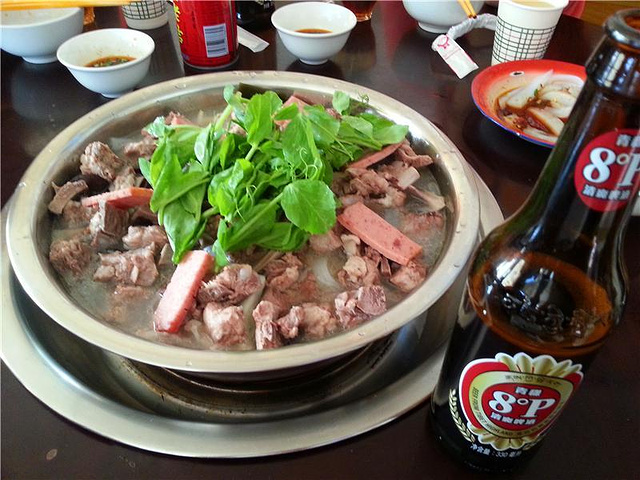 认熟不认生,还他家,要了个大的骨头汤锅,点几样配菜,青稞啤酒吹上~