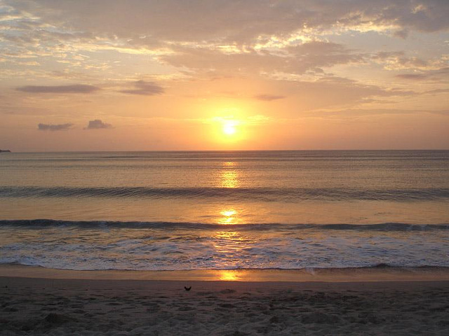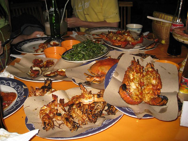 这里是巴厘岛最出名的看日落品海鲜的地方。6点左右我们在海滩上坐待夕阳西下,看着远处的小太阳慢慢地从一个蛋黄变成半个,1/3,直到消失在海平面上。海滩上一到傍晚各式海滩排挡就在沙滩上排出餐桌,沿着金巴兰海滩询问过去,海鲜的价格差别非常大,而且可以砍价。主要以龙虾为主,其他的小虾、贝壳类都是送的,还包括青菜,饭和饮料。青菜和饭实在很难吃,海鲜也都以烧烤为主,入夜餐桌上会点上蜡烛,有乐队弹奏乐曲,当然点歌要掏钱的,还能听到很熟悉的国内流行歌曲。