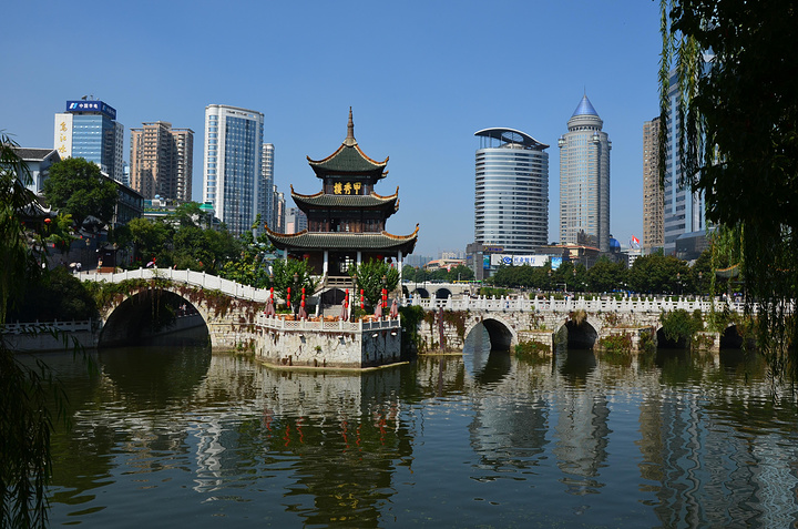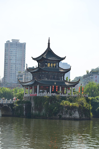 甲秀楼是贵阳的地标性建筑,始建于明朝,有“科甲挺秀”之意,坐61路公交车经过南明河在邮电大厦下车,走下河边,在这里可以拍到甲秀楼倒映在水中的照片。四周现代化的高楼林立,而甲秀楼静静地伫立在河中央,显得庄重而宁静,走过浮玉桥,登上甲秀楼,一楼是甲秀楼的文物陈列,二楼卖一些纪念品和字画。更有诗句“飞檐甲天下,落影秀寰中”,走到甲秀楼旁边的翠微园,呈现在眼前的景象略微带给人惊喜,在贵阳这座西南的山城里,居然能看到江南园林的影子,亭台楼阁、水榭花墙,十分幽静。身处喧嚣的都市当中,甲秀楼以它古朴的姿态存在着,保存着贵阳古老的历史记忆。