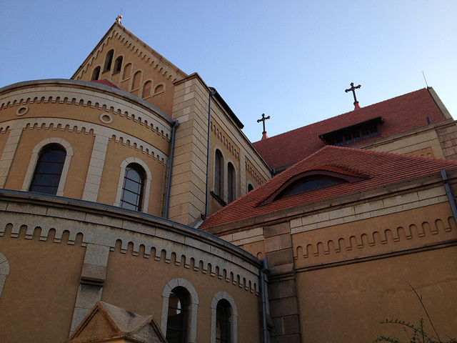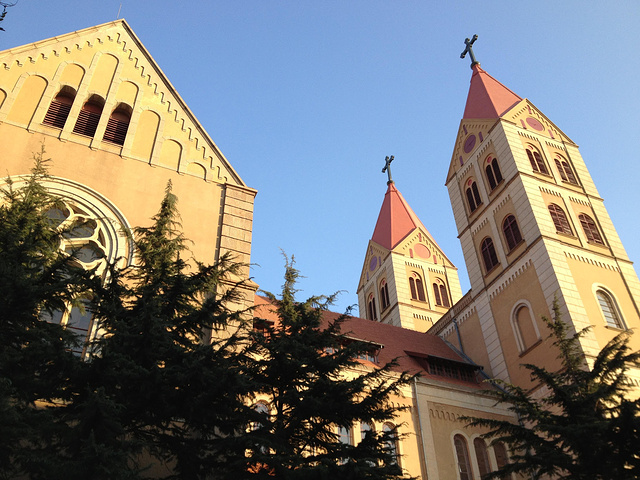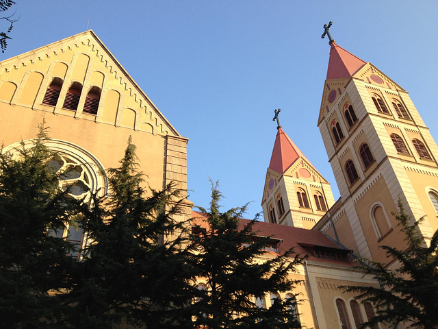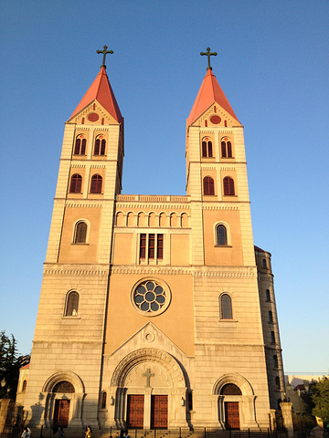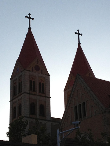 青岛德国建筑群之一,逛完信号山下的基督教堂后,一路走过去,找到了天主教堂,周边有许多的名人故居,还有一个老舍公园。我去的时候,不是礼拜天,因为是下午时分,教堂没有开门,只能在外面看了看,里面有一个玛利亚的雕塑。里面的人说明天再来吧。没有能够进去。这么高的教堂,内部一定值得一观。教堂广场上三三两两的人,还有一些人在拍婚纱照,天气冷,刮着风,穿婚纱的新娘子冻得瑟瑟发抖。摄影师躺在地上取景,傍晚时分,光线不好,所以拍照效果不佳。看着教堂顶上两个巨大的十字架,湛蓝的天空下,显得那样的美丽。虽然留下遗憾没有进去,但以后有机会去青岛,还是会再去游玩一番。也希望有机会去里面听一听赞美诗。