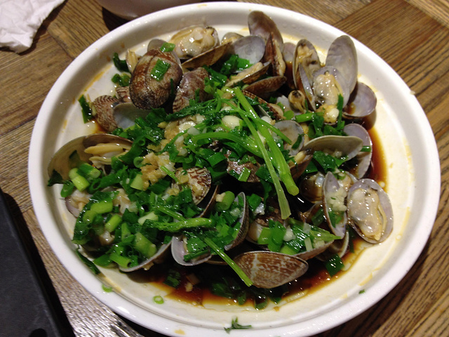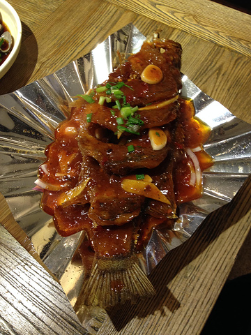 这家店值得深度推荐,菜价便宜而且好吃,不过人爆满,得排队。LZ点了4个菜,烧味双拼、葱油花蛤、铁板鲈鱼和蒜蓉空心菜,总共才100元。铁板鲈鱼是酸甜的,鱼外焦内嫩,非常好吃,推荐一下。