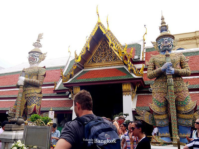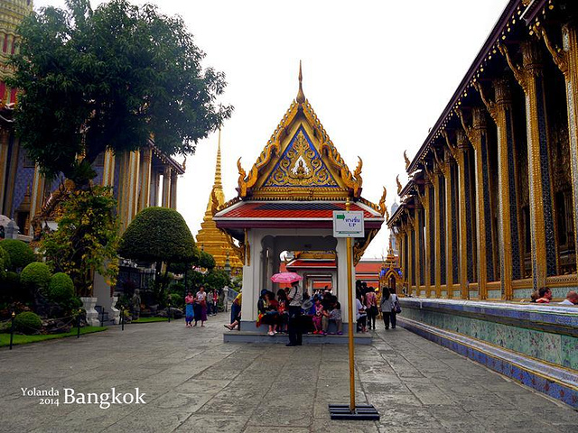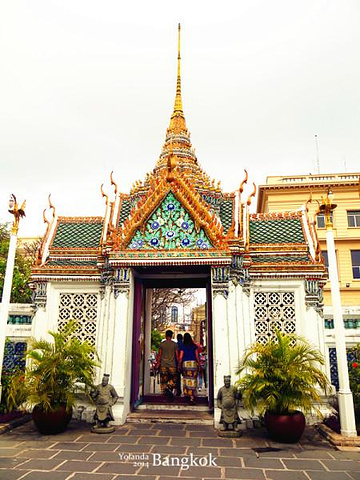 【TIPS】进大皇宫不能穿着暴露,露膝盖和肩膀的都不可以。在入口处可以租围纱,租金一般为40泰铢左右,不过要排队,如果想节省时间的话最好提前带围纱或者穿好长裤和有袖子的衣服。