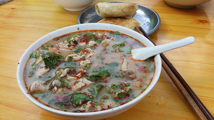 据说是家百年老店,羊肉汤25元一碗,饼1元一个,店面很小很旧,卫生一般,但是生意不错,回头客很多,老两口一个收钱一个烫肉,一个稍年轻的小伙子在片羊肉,调料自己加,在路边树下享用美食,十分惬意。不习惯羊膻味的慎点哦。