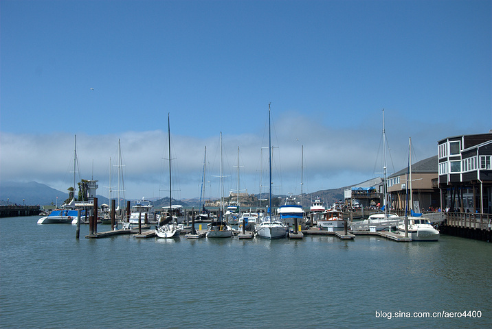 这里因为成群的海狮吸引无数游人驻足观看。码头边有不少船只停靠,晴朗的天空倒影映在水面十分漂亮