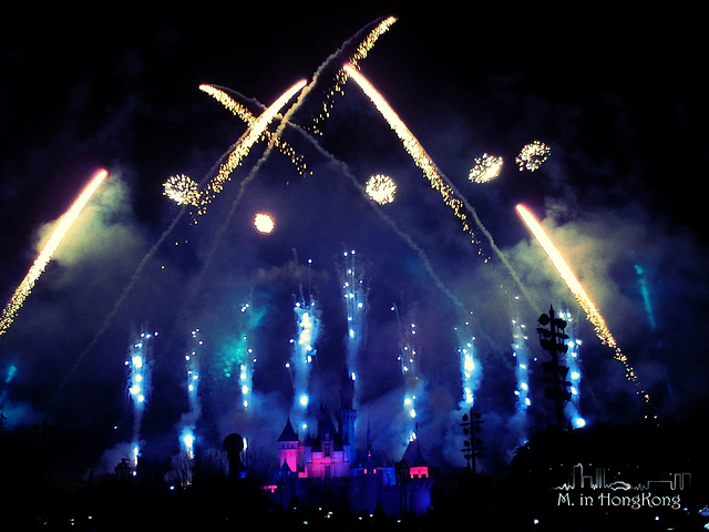 除了这些有趣的项目,不容错过的还有花车巡游和烟花表演。 花车巡游的开始时间是下午3:30,一定要早早的在睡美人城堡前的广场占据了好的位置观赏,一场迪士尼嘉年华,那些熟悉的、不熟悉的卡通明星,在装饰精美的花车上进行精彩的表演,一副热闹又欢乐的场景。 “星梦奇缘”烟火表演开始于晚上8:00,最佳观赏点仍是睡美人城堡前的广场,却是我对迪士尼之旅最念念不忘的片段。原以为不过是焰火而已,看过方知,焰火竟也可以美到这般。——色彩斑斓的焰火划过黑暗的夜空,勾勒出睡美人城堡的轮廓,绽放,陨落,昙花一现的美丽。真的是醉了,流光似水,韶华如梦。