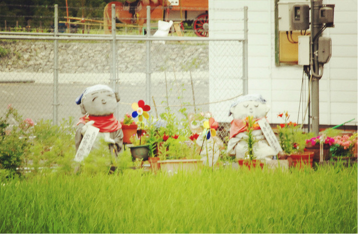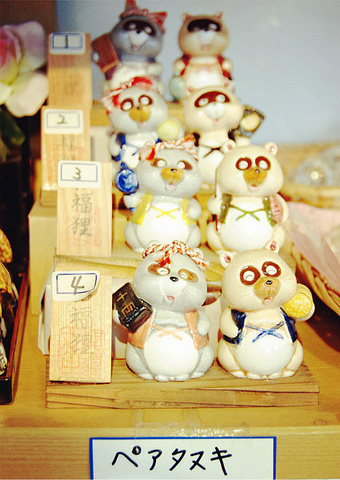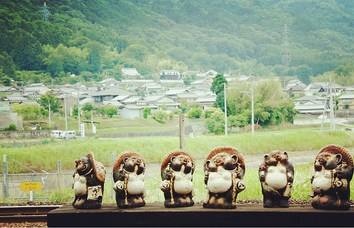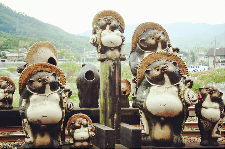 ↑ 买完票,在“龟冈站” 等车时逛逛纪念品店。 ↓ 出来到站台,看见铁道边竟然也有这些狸猫的雕塑!(是狸猫吧?......~)