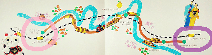 这是岚山地区的轨道交通路线图。 现在我所在的位置是“游览小火车嵯峨站”(画紫色圈圈的地方)。 可以看到,下一站就是「渡月桥」所在的“岚山站”。 售票处的工作人员告诉我—— 从这里(起始站)步行至「渡月桥」仅需10分钟左右,而从终点站“龟冈站”走回「渡月桥」则至少需要半个小时。 既然我既想坐火车,又想去「渡月桥」,那么她建议我从这里乘坐 JR电车 到“JR马堀站”(画粉色圈圈的地方),再买游览小火车的票,坐回“岚山站”,比较经济实惠~ ▲Tips:『嵯峨野浪漫小火车』票价_单程600円;往返1200円;单一票价。 听人劝,吃饱饭! 更何况那位工作人员的建议确实很好——省钱又省时!爱你么么哒~~~