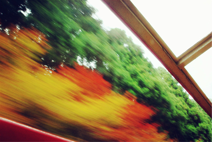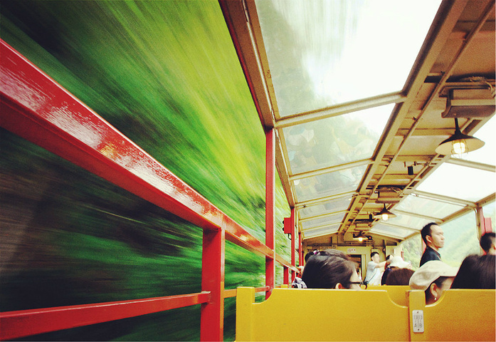 木质座椅,透明天花,没有玻璃的护栏; 红黄两色的配搭,在两旁绿树的映衬下,活泼又鲜艳。