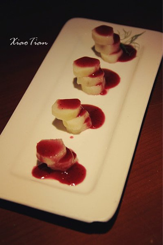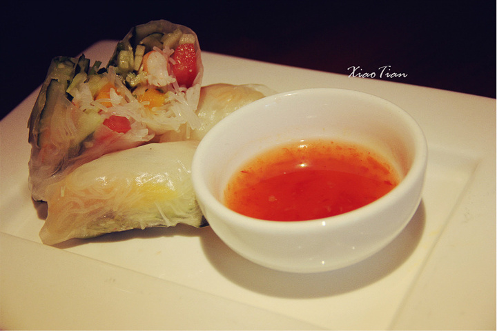 芒果鲜虾卷,那个酱汁不错,好吃。绿茶烤鸡,感觉一般般,肉质不是很嫩,麻辣味